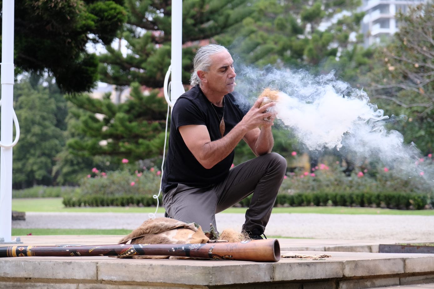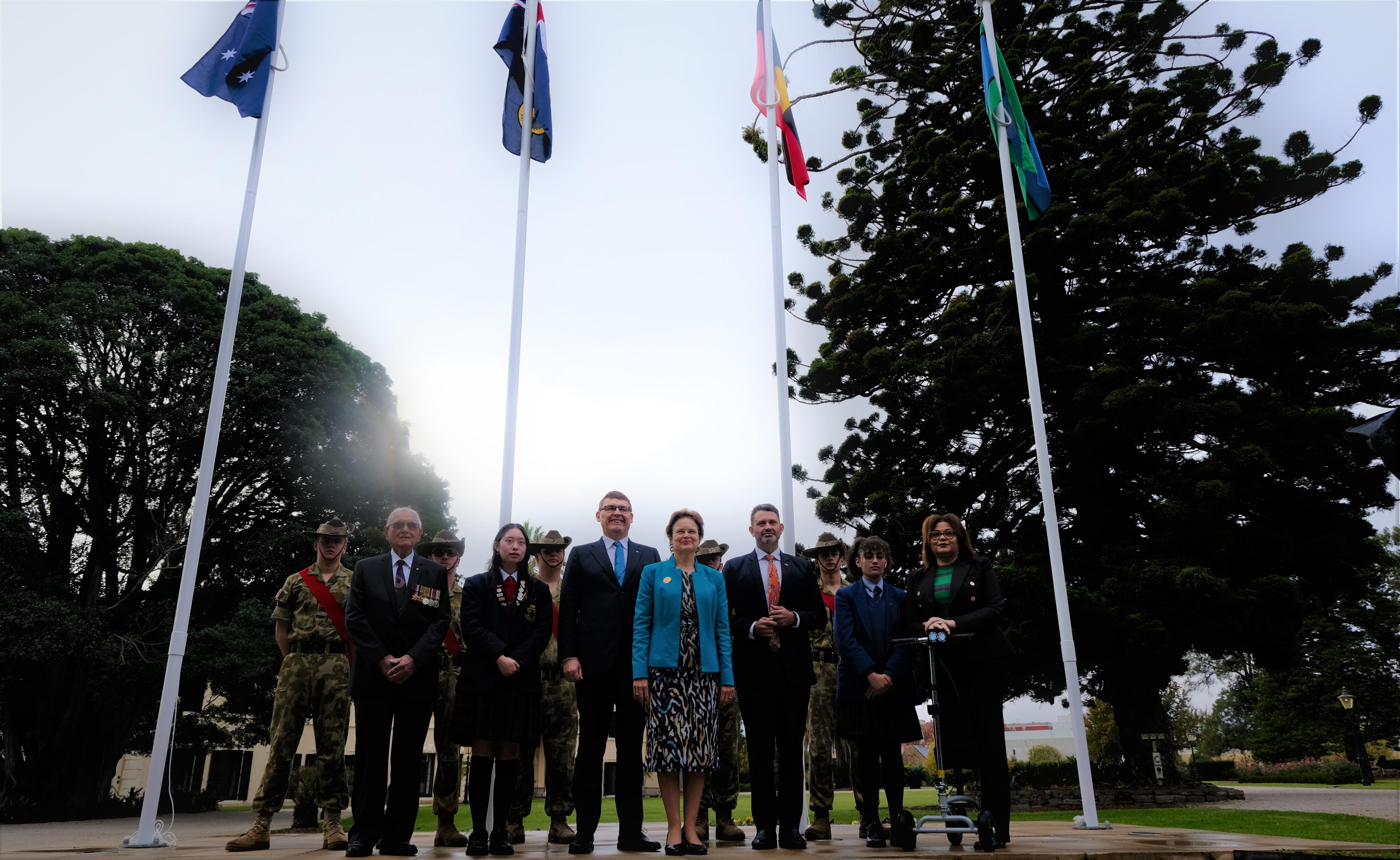 World War II veteran 102-year-old Keith "Chook" Fowler raised the Australian national flag and Our Lady of the Sacred Heart College Lara Nguyen raised the state flag.