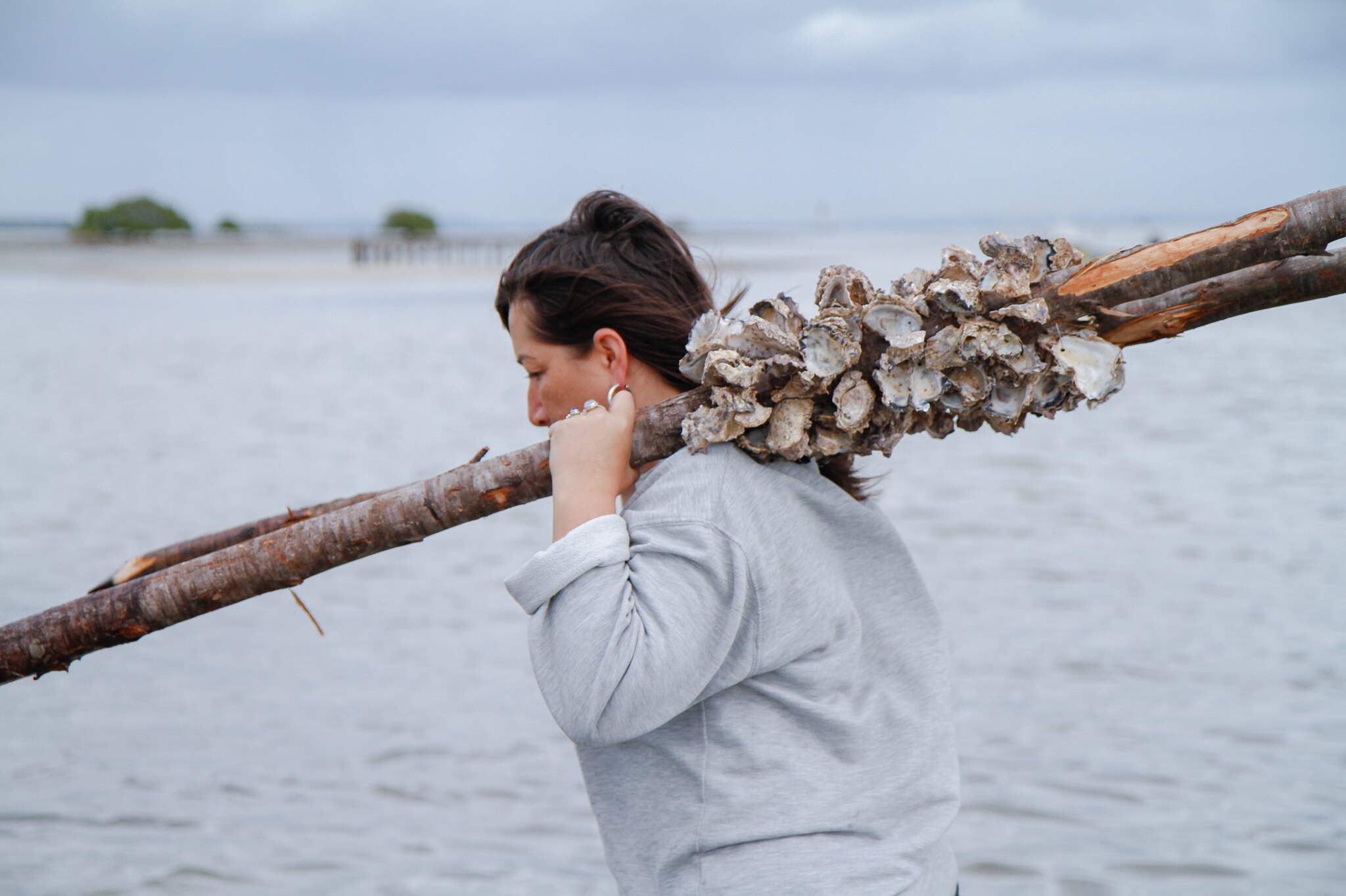 The artist is building a living, breathing artwork — an oyster reef, created one oyster pole at a time.