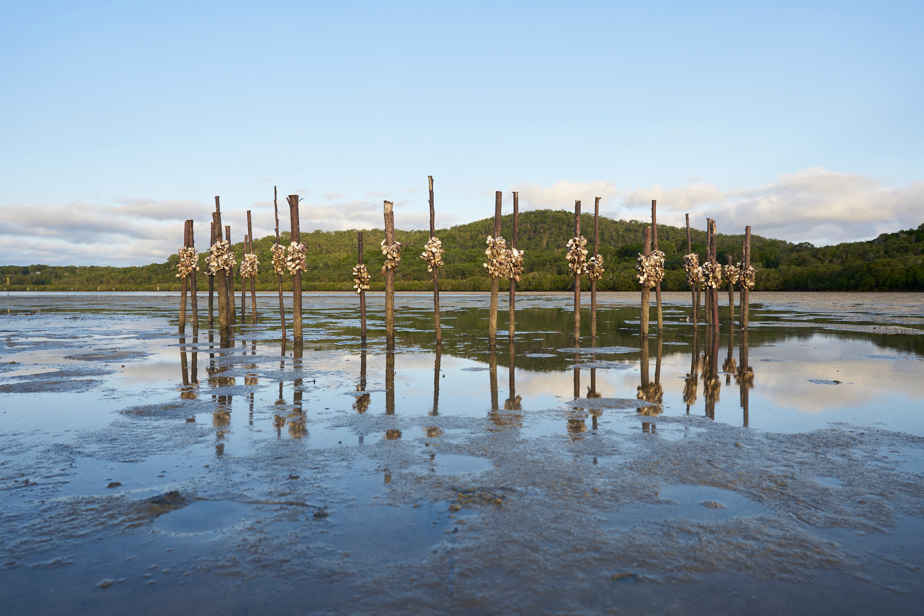 The answer, for Cope, has been to spend more time on Country, listening to the stories of generational oyster farmers, such as Quandamooka Elder Uncle Ricky Perry, and learning about the oyster banks and the impacts of colonisation and climate change. It was this engagement with Country that helped spark the idea for Kinyingarra Guwinyanba.
