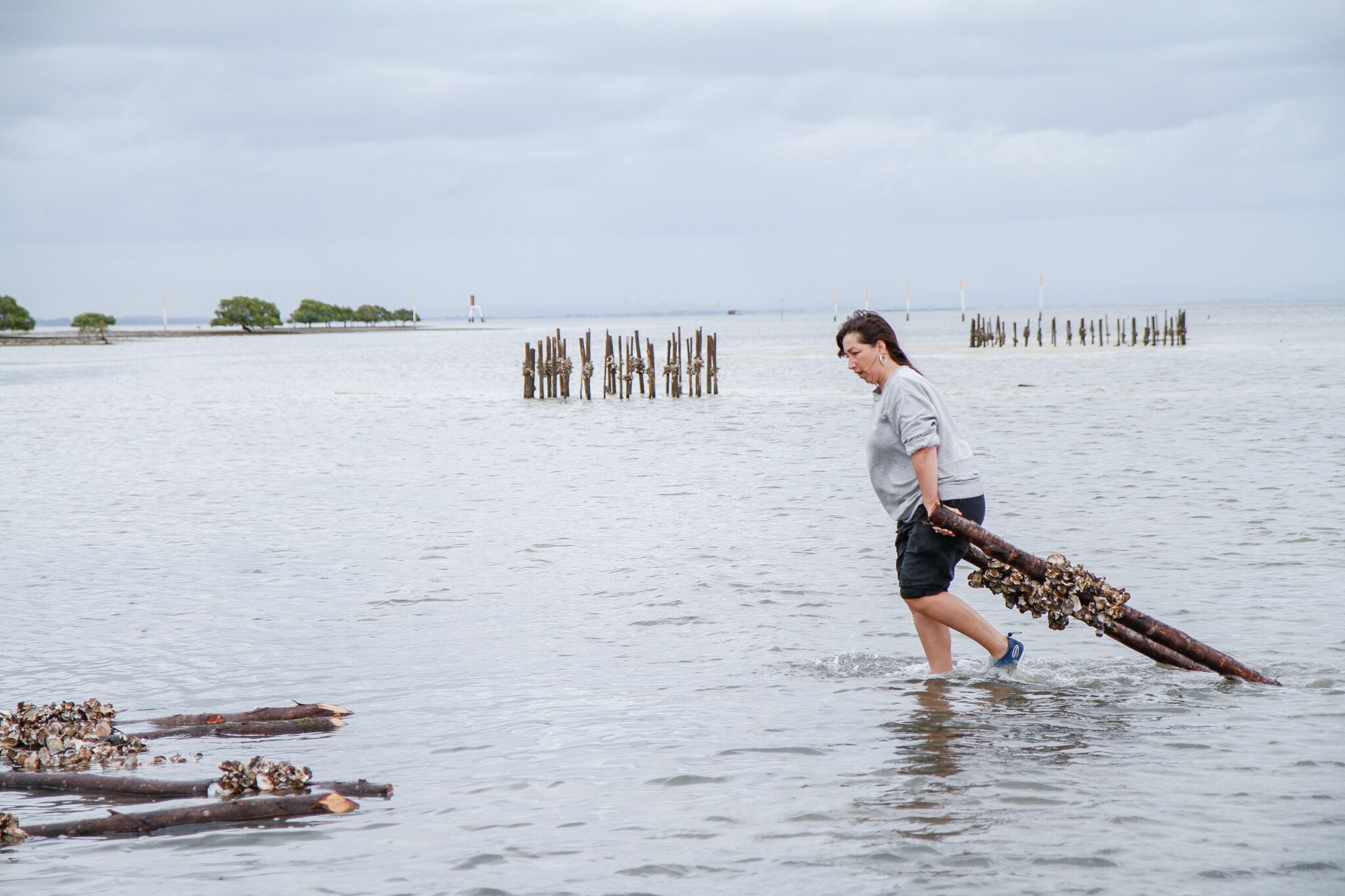 "Whatever happens with the timber, these clusters of oysters will become a reef, a form that's living and can continue to build on itself. The timber is a temporary elevation so that they can establish themselves," says Cope.