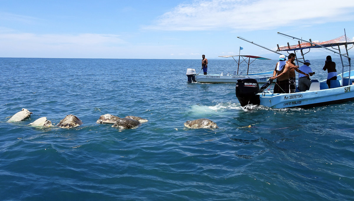 The olive ridley turtles, which Mexican authorities say are at risk of extinction, measure about 75 centimeters (29.5 inches) in length and weigh some 45 kilograms (99 pounds). From May to September, they descend on various Mexican states along the Pacific Ocean to lay their eggs.