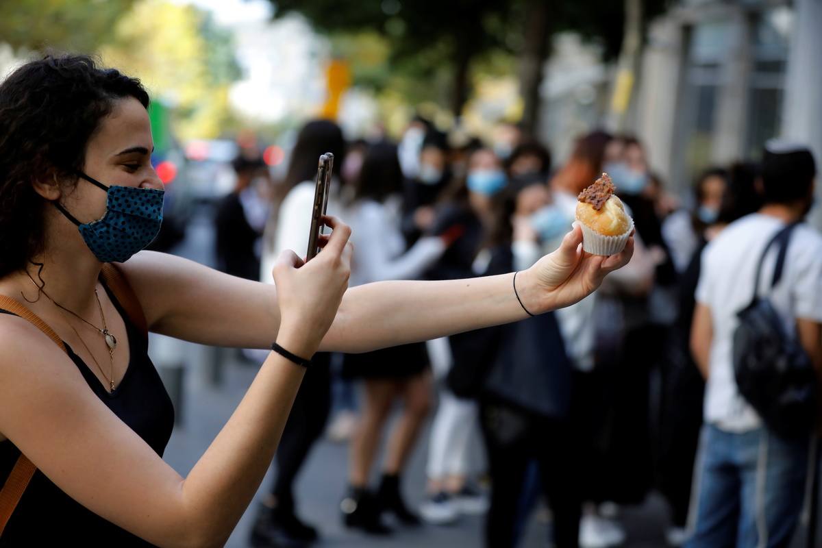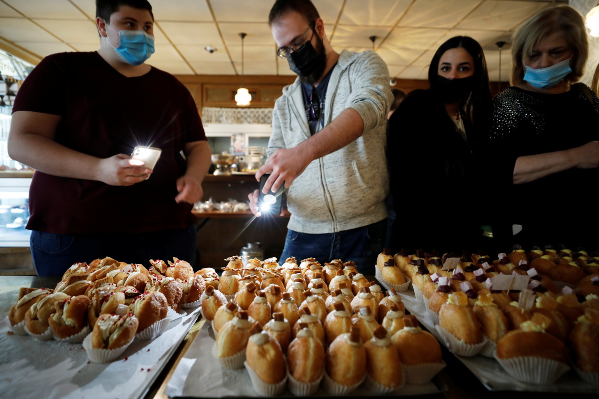 Customers take photos of "Abu Dhabi" doughnuts, a date-flavoured confectionery inspired by Israel's new relations with the United Arab Emirates, as doughnuts are a popular fare in Israel during the current holiday of Hanukkah, in which Jews traditionally eat deep-fried delicacies, at a patisserie in Jerusalem December 13, 2020. REUTERS/Amir Cohen