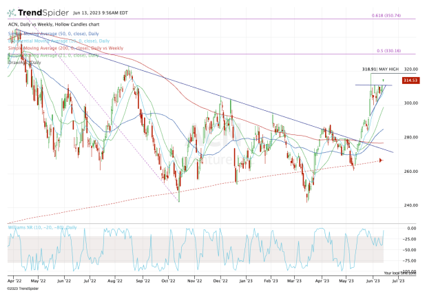 If Accenture stock can clear that level, it opens the door up to the 50% retracement of the bear market range at $330.