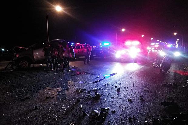 Police said that according to witnesses the accident occurred at about 10pm on the road in front of Watthana Nakhon Hospital when a motorcycle drove out of the hospital and cut in front of an oncoming Toyota Fortuner, causing the two vehicles to crash.