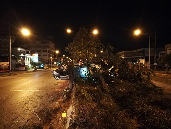 Phoon Nuchrungruang, a security guard at a car repair shop on Phichai Songkhram road, told police the accident occurred at about 2am when a Nissan Navara, which was heading for downtown Phitsanulok, slid sideways onto the median strip at a bend in the road, rammed into a tree and overturned.