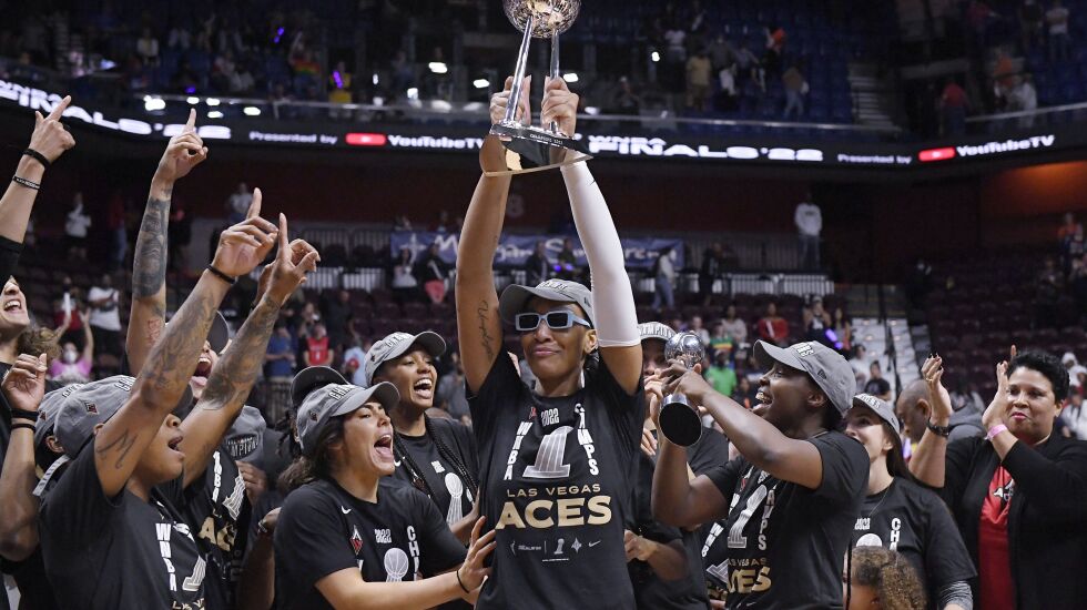 Aces owner Mark Davis, who also owns the NFL’s Las Vegas Raiders, wasn’t with his football team Sunday. He was in Connecticut to get a trophy. He hoisted it, then turned it over to gleeful players who did the same.