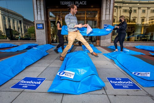 If you happen to wander past Facebook’s Washington, D.C. headquarters today, you might be treated to quite an unusual sight: Bright blue body bags — a dozen of them — lining the sidewalk. From a distance they appear to hold real human bodies in that surreal blue plastic; it’s only upon closer inspection that you’d notice the white tags, each with a Facebook logo and the words “DISINFO KILLS.”