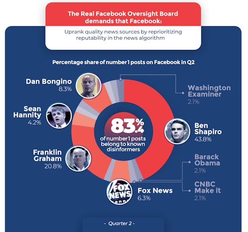 Moreover, the RFOB analyzed data collected by @FacebooksTop10, a Twitter account that posts the 10 top-performing link posts in the U.S., and found that more than 83 percent of the number-one posts during Q2 2021 were shared by just five people — all of whom are well-known for spreading false information through Facebook.