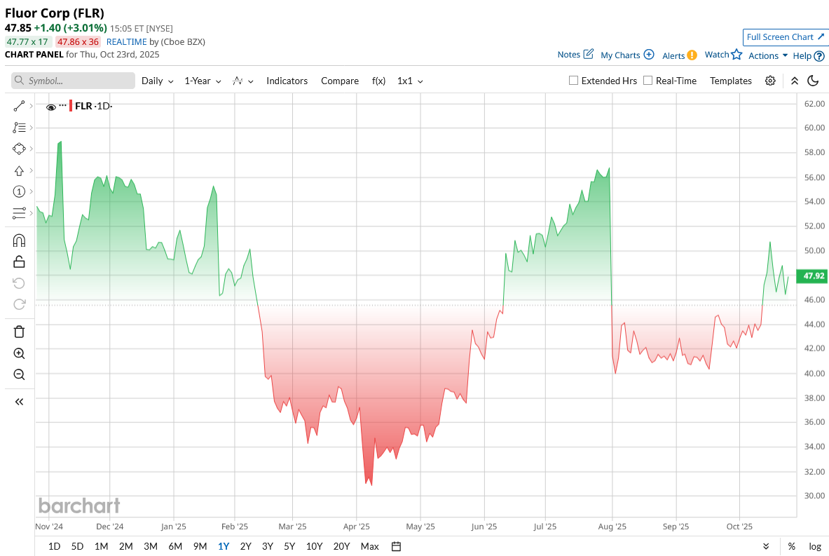 One such opportunity may be emerging in Fluor Corporation (FLR), a global engineering and construction giant. Shares of Fluor gained attention this week after Starboard Value revealed a nearly 5% stake in the company. The activist fund, led by Jeff Smith, is reportedly urging Fluor to explore options for its 40% ownership in NuScale Power (SMR), an investment that has surged nearly 110% this year.
