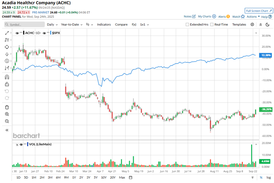 Currently valued at about $2.5 billion by market capitalization, shares of this healthcare company have struggled to perform well on Wall Street. Over the past year, ACHC stock has tumbled nearly 52%, even as the broader S&P 500 Index ($SPX) has gained 17%. The weakness has persisted into 2025, with the stock down 32% year-to-date (YTD), compared to a 14% advance for the index. However, momentum has recently begun to swing in Acadia’s favor, with activist pressure sparking renewed optimism. The stock has snapped back 10% in just five trading days, marking a notable shift after its extended slide.