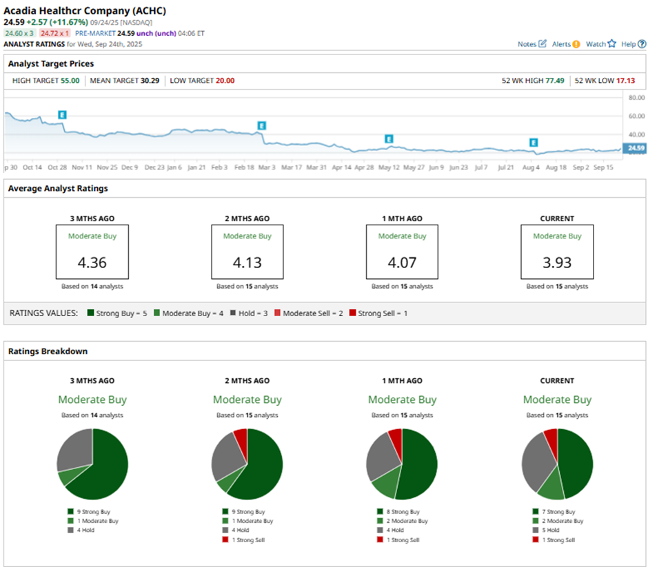 Even after a bruising stretch for ACHC stock, Wall Street hasn’t completely turned its back on Acadia. The stock currently carries a consensus “Moderate Buy” rating overall, reflecting a mix of optimism and caution among the 15 analysts covering the name. Of those, seven see Acadia as a “Strong Buy,” two lean toward a “Moderate Buy,” five are sitting on the fence with a “Hold,” and just one has a “Strong Sell" rating.