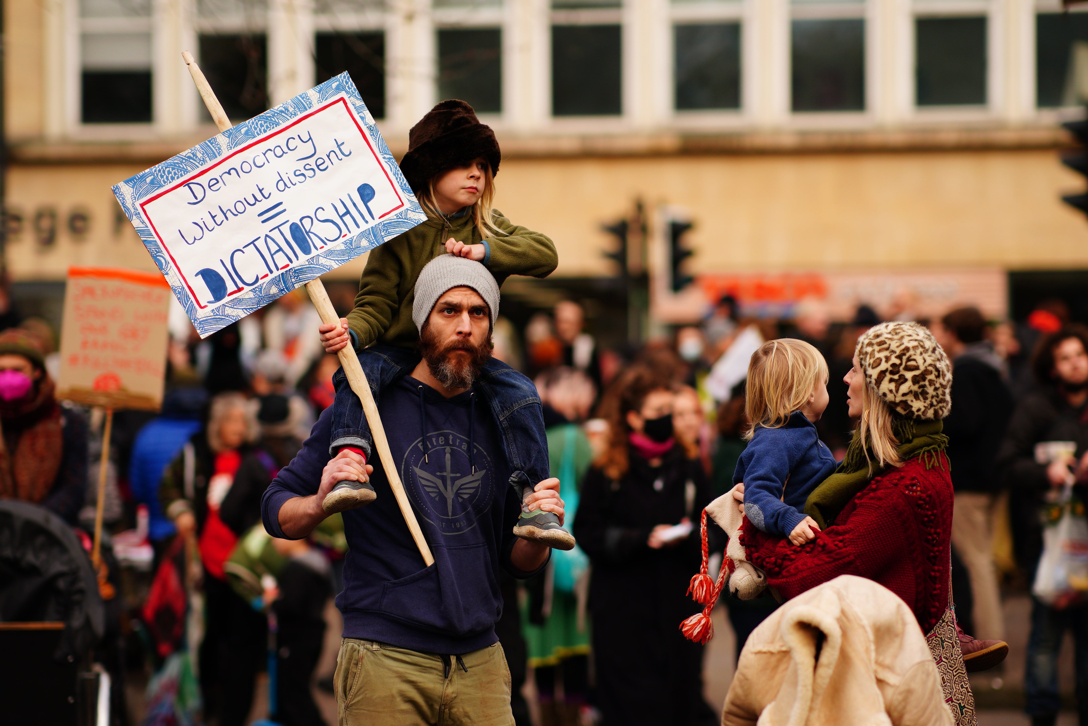 In Bristol, some of those gathered on College Green held decorated riot shields and placards that read “remove the Tories, not our rights” and “democracy without dissent = dictatorship”.