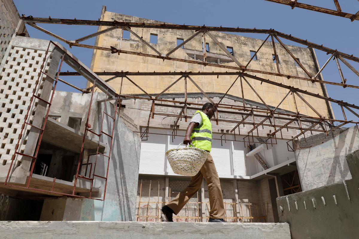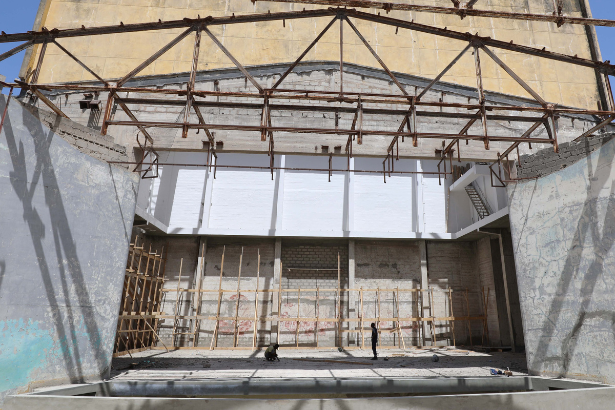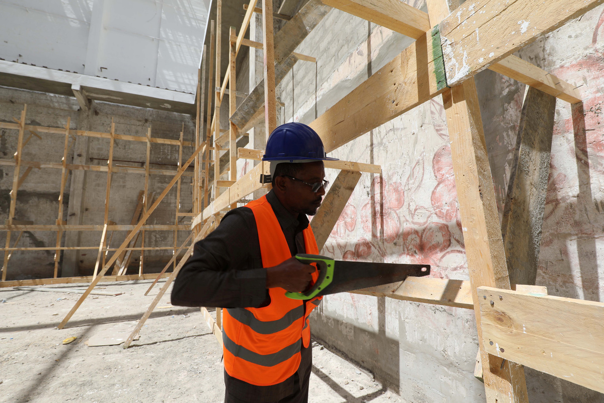 Around him, builders heave loads of cement, saw at wooden scaffolding and shift piles of rubble as they prepare to reopen the building in May, even as the Islamist insurgency rages on.