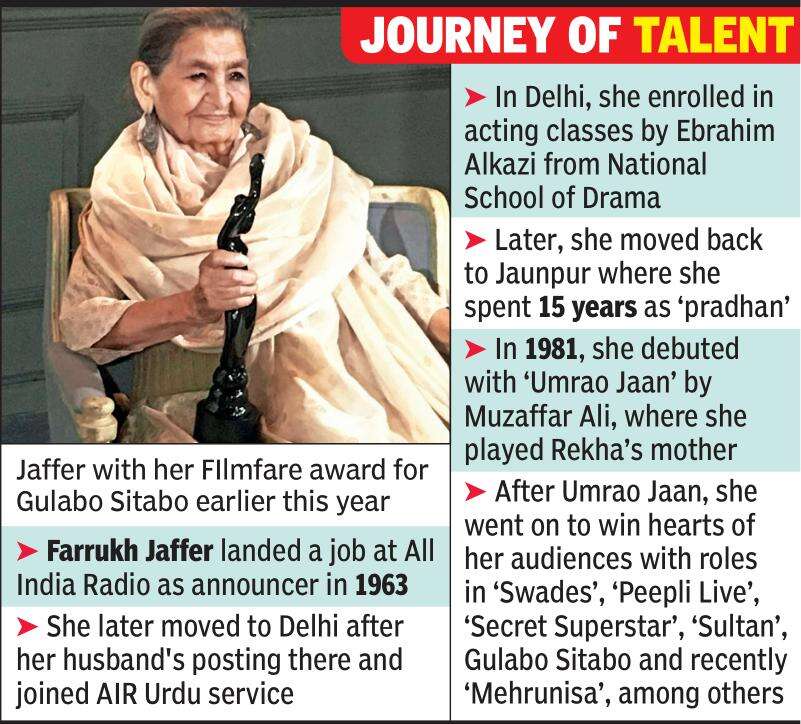 LUCKNOW: Amitabh Bacchan’s ‘Begum’, Rekha’s mother in Umrao Jaan, ‘Badi Apa’ in Secret Superstar — veteran actress Farrukh Jaffer passed away on Friday here at the age of 88. Jaffer was not keeping well for some and breathed her last at a private hospital.