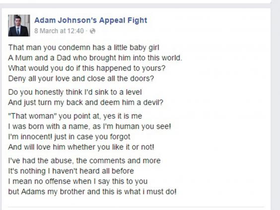 The sister of convicted child sex offender Adam Johnson has written a poem defending him and protesting his innocence.