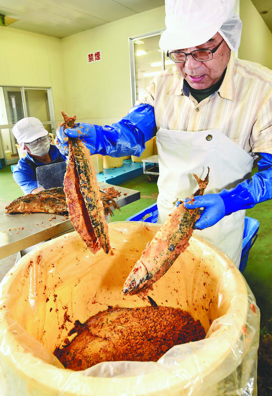 Mackerel is first salted in a container for about a week, during which a liquid emerges from the fish. The liquid is then heated, cooled down before adding soy sauce, mirin, shochu distilled liquor, sake lees, rice bran and other ingredients. Then the fish is further pickled in the mixture.