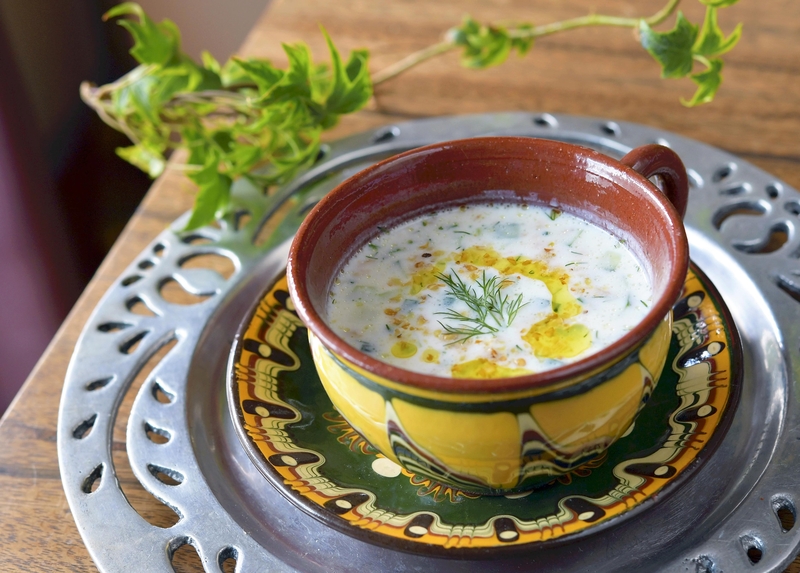 The soup called tarator in Bulgaria consists of plain yogurt that is diluted with water. Cucumbers, garlic and walnuts are also added, along with dill for aroma. It is either served chilled or with ice cubes.