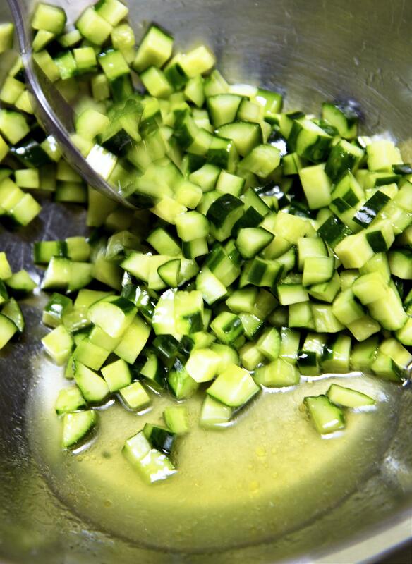 The main ingredient is cucumber, which needs to be diced. Sprinkle some salt and drizzle a bit of olive oil on top. Let the cucumbers sit until they are tender, so they can be mixed more easily into the soup.