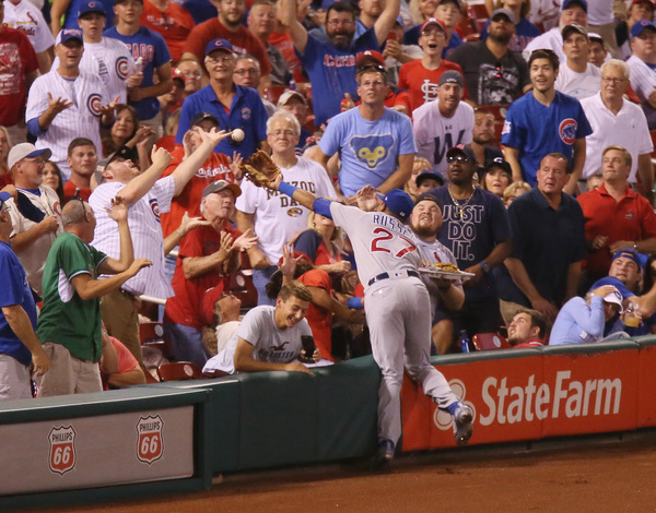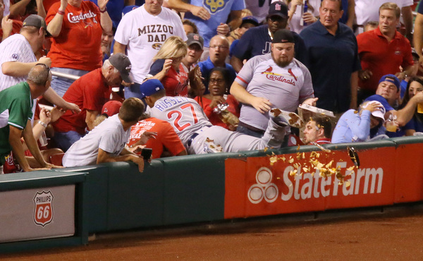 Addison Russell didn't convert a Cardinals fan when he dived into the stands and spilled his loaded nachos on him in the second inning of Monday night's game at Busch Stadium.