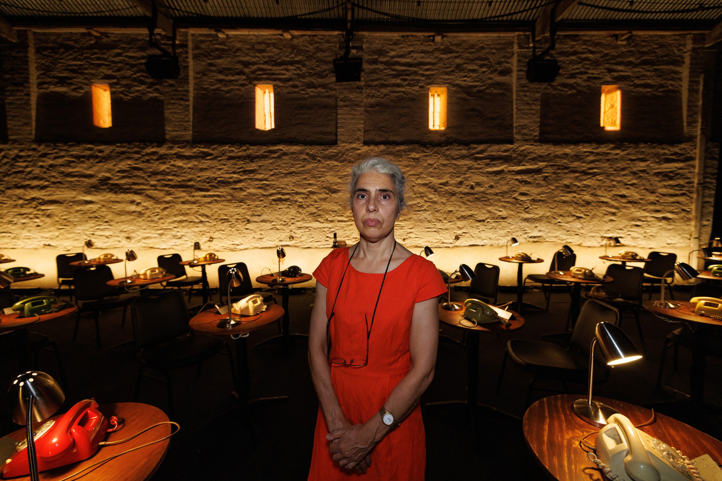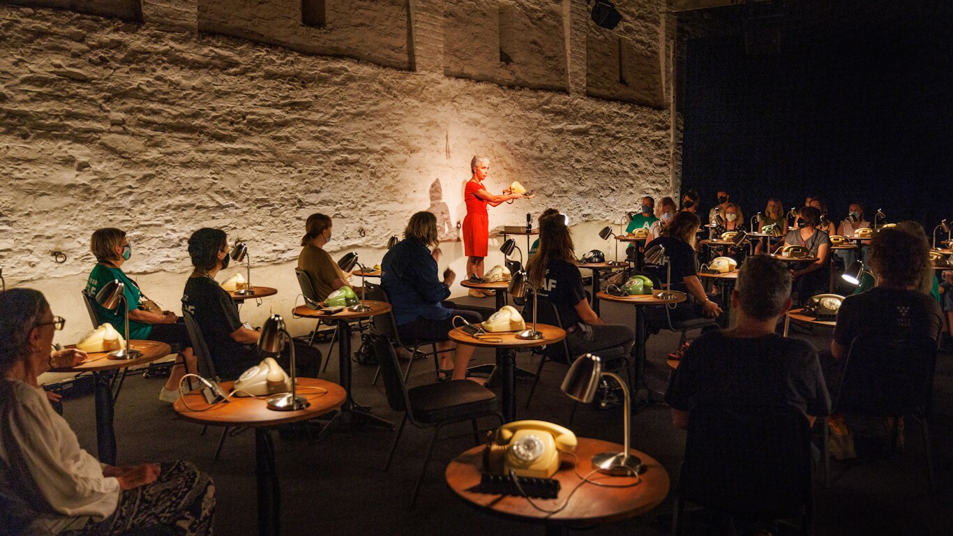 You're greeted at the threshold by a stern "concierge" (performer Katia Molino), and ushered into a room with rows of small tables each bearing a lamp, a rotary telephone and an old-fashioned 'line exchange' with eight slots. Each audience member sits at a table, picks up their receiver, and plugs in their cable; the calls begin — or rather, pre-recorded messages left by insomniacs, night workers and other sleepless souls.