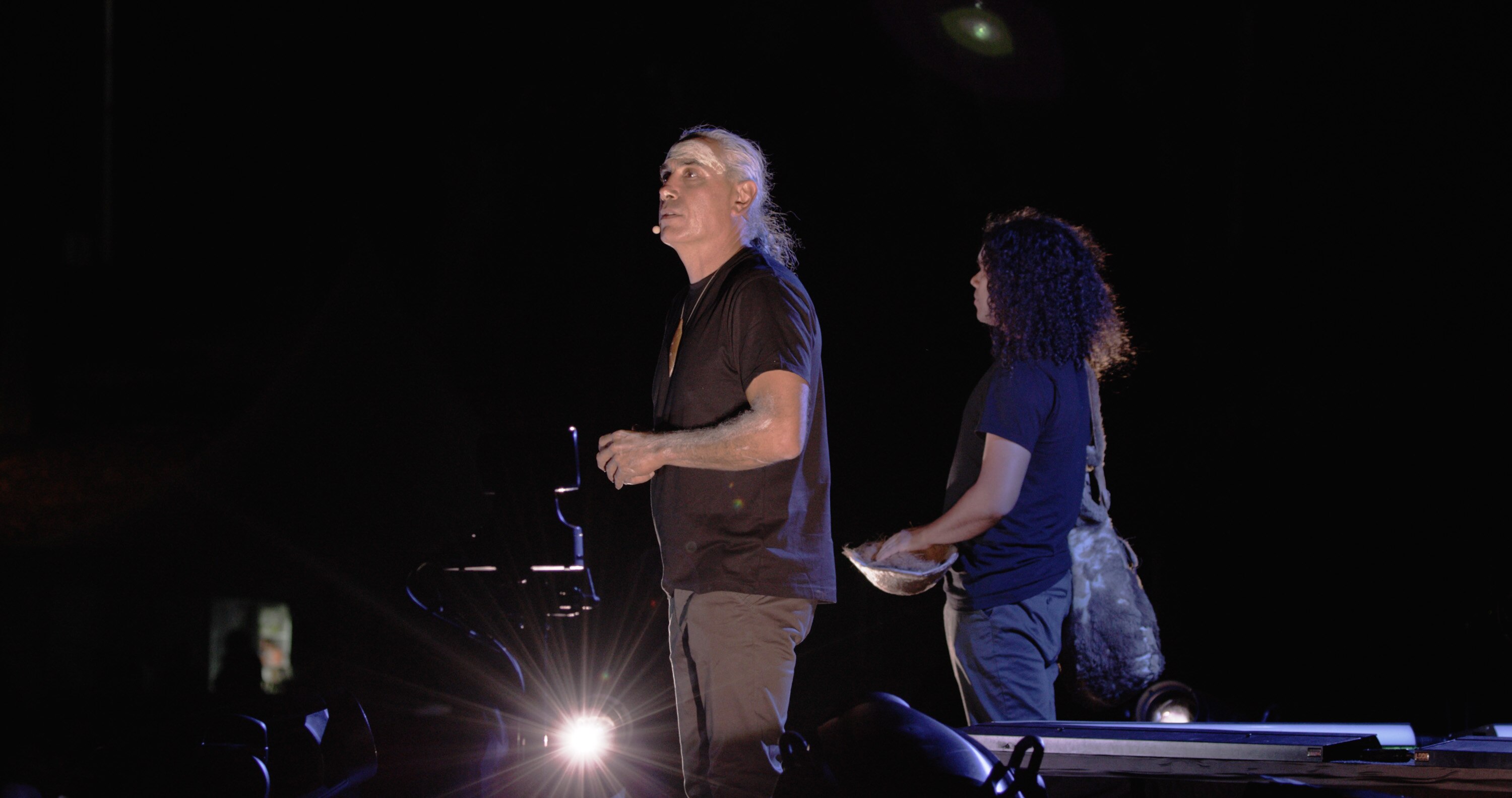 MACRO opens not with a Welcome to Country, but a "Spirit of Place" ceremony led by Karl Winda Telfer, Burka (senior cultural custodian of ceremony) of the Mullawirra meyunna (Dry Forest people, Southern Country), and his daughters.