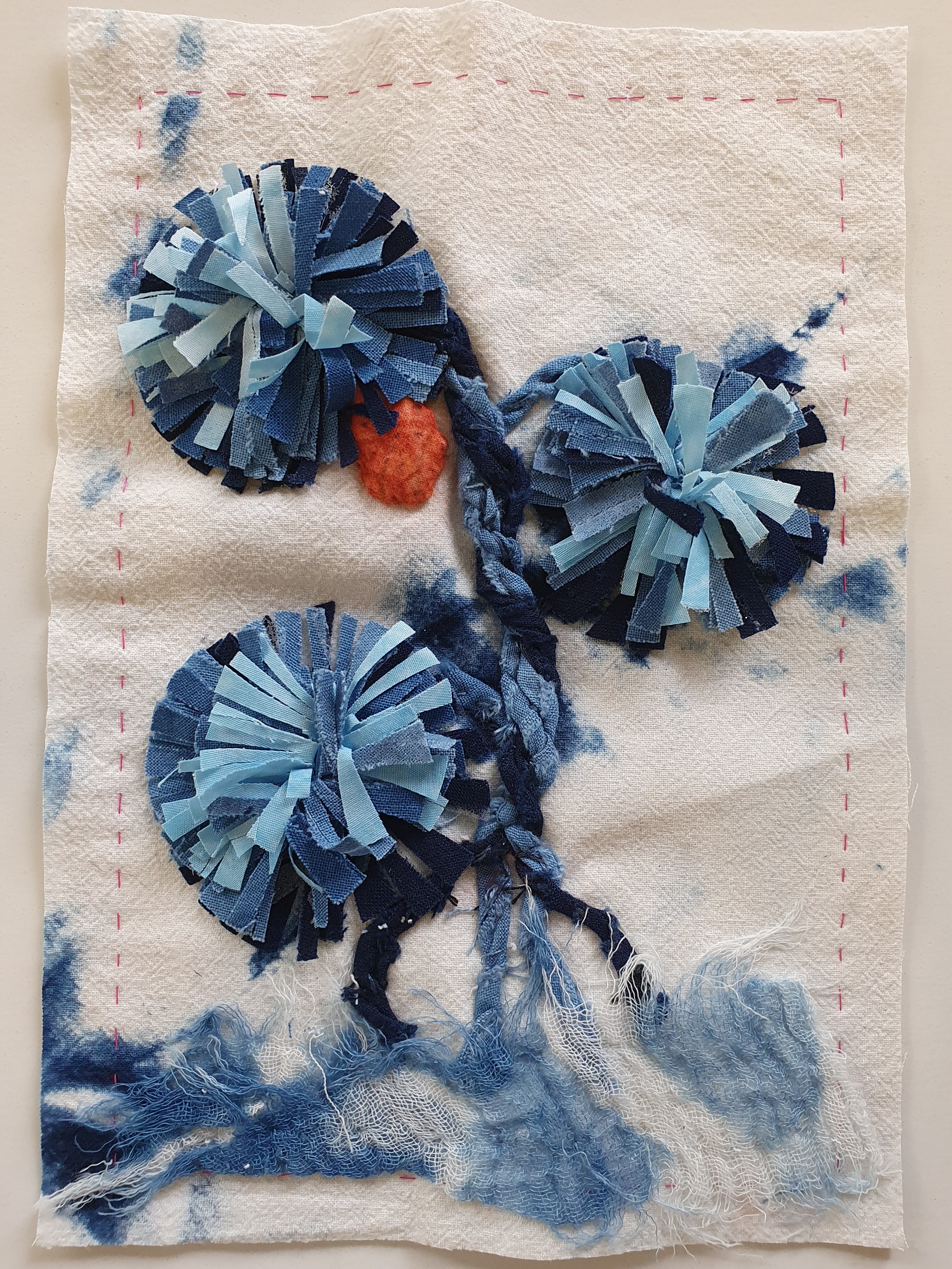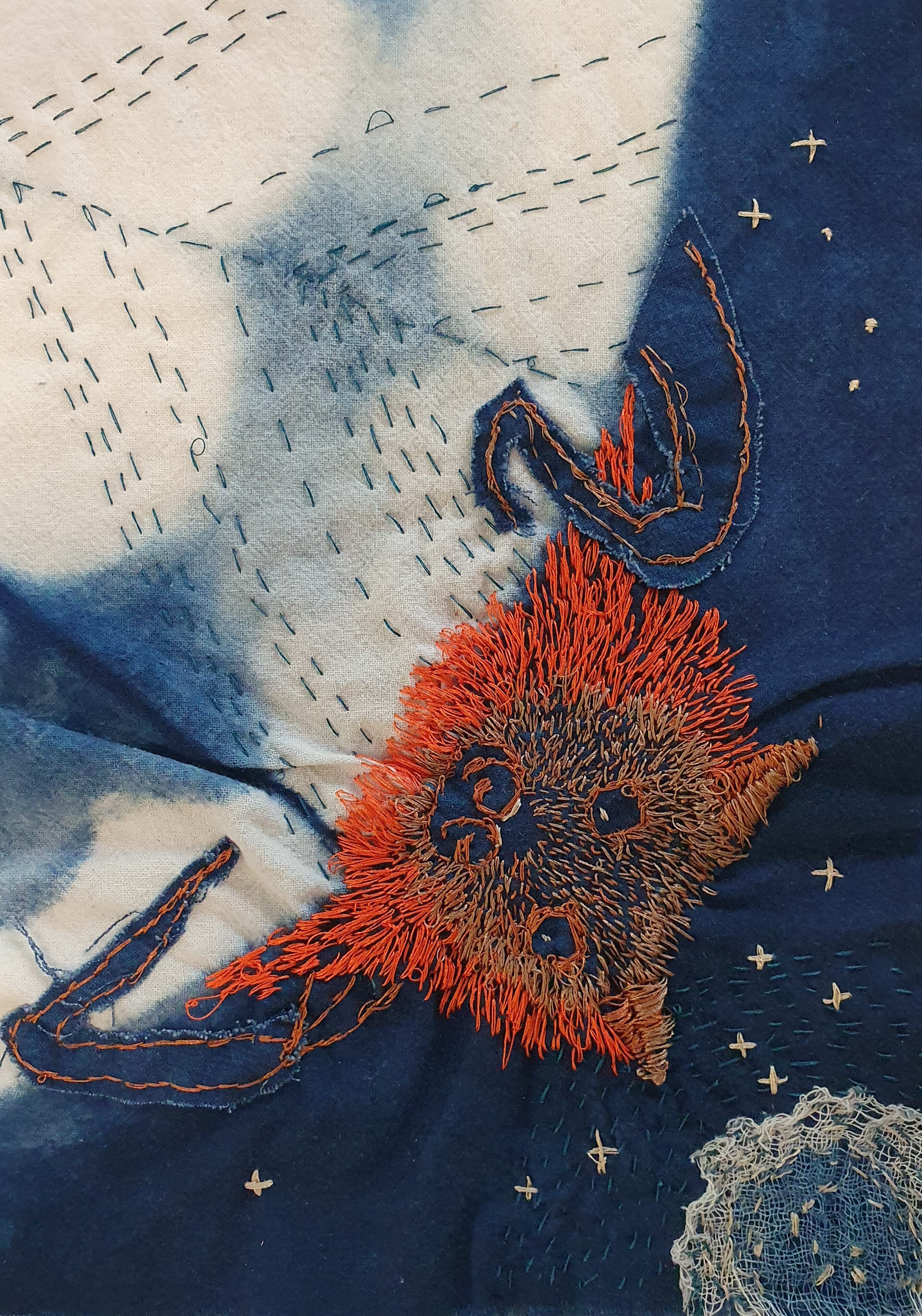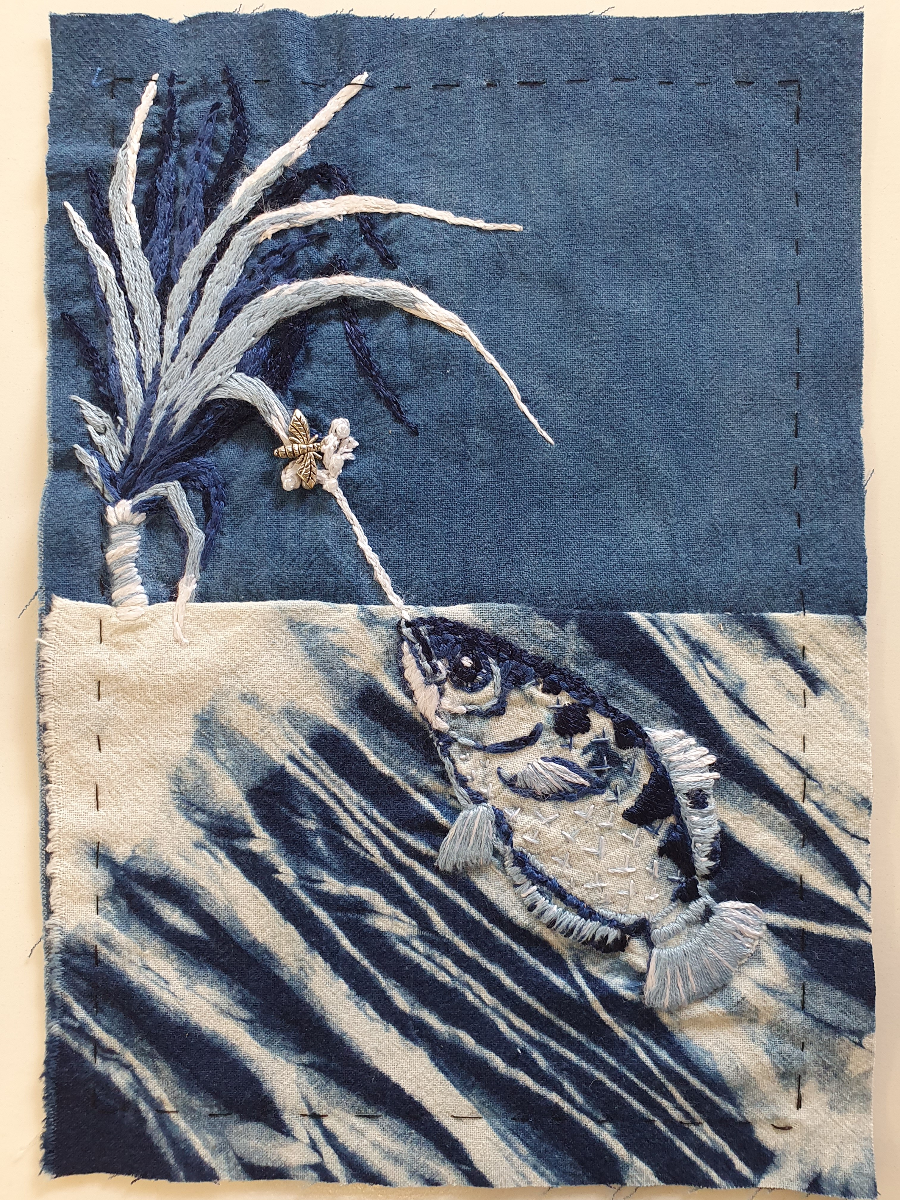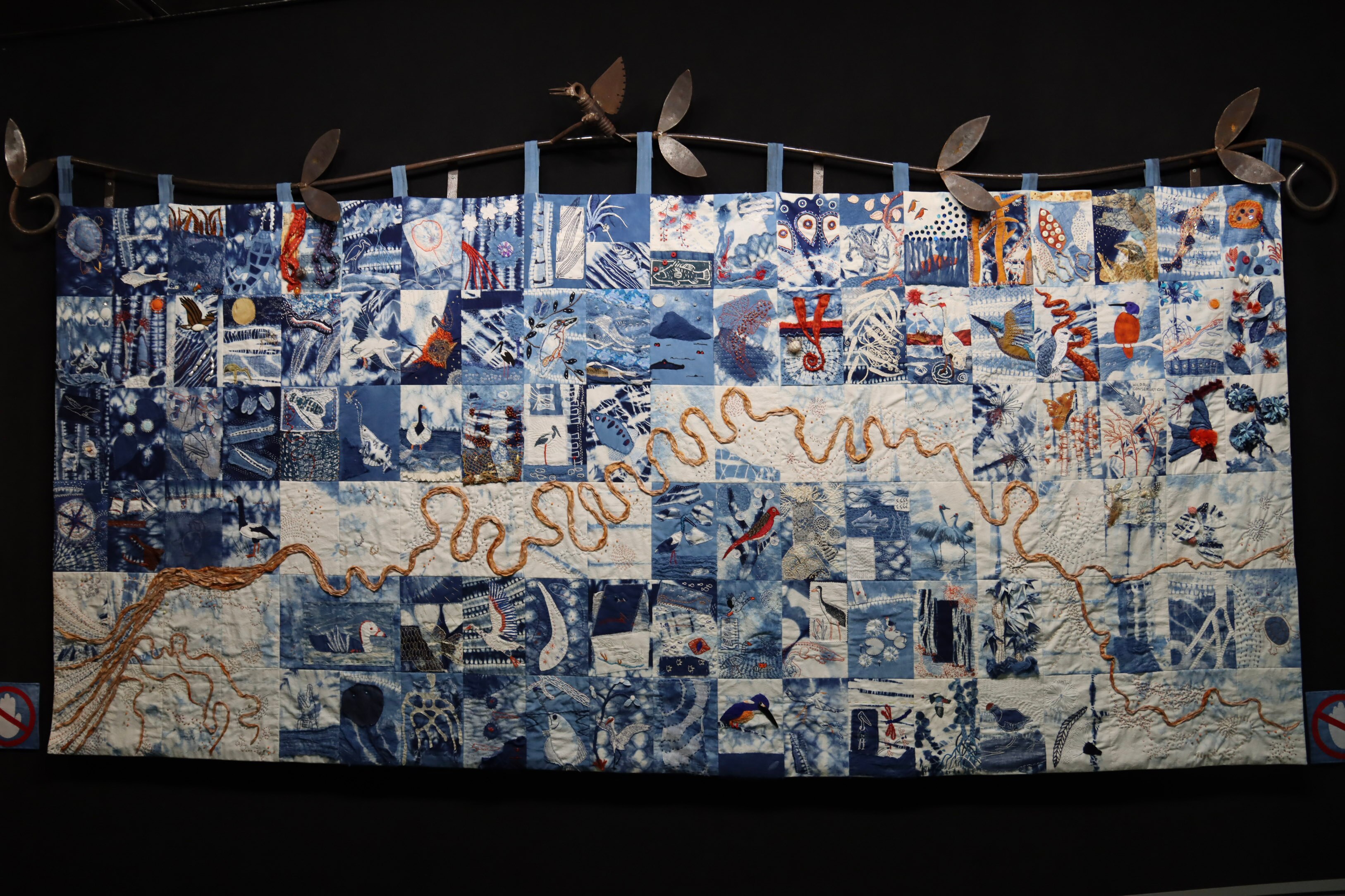 Before the stitching began, each participant was given a list of plant, fish and animal species along with several pieces of recycled calico dyed with indigo to represent water.