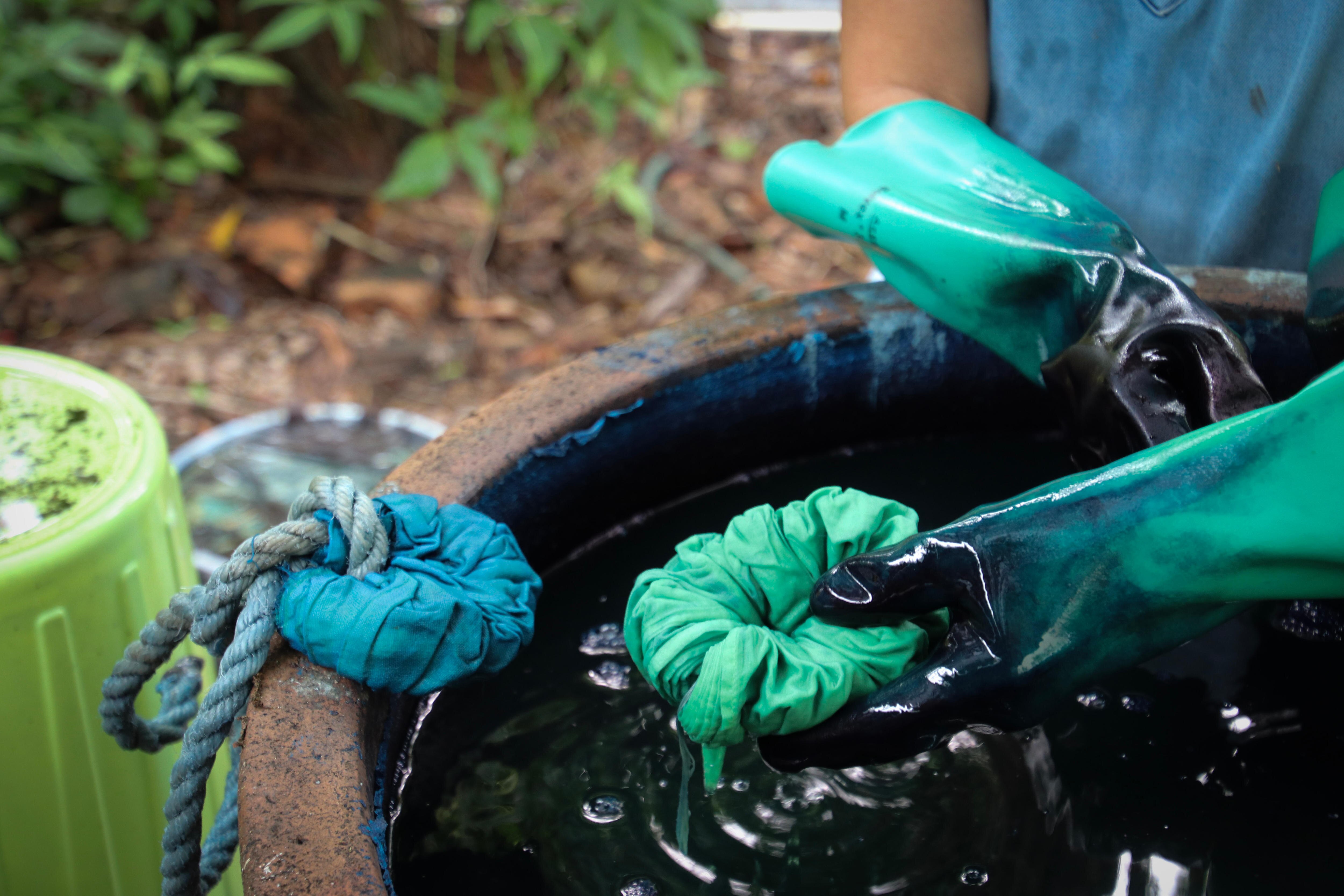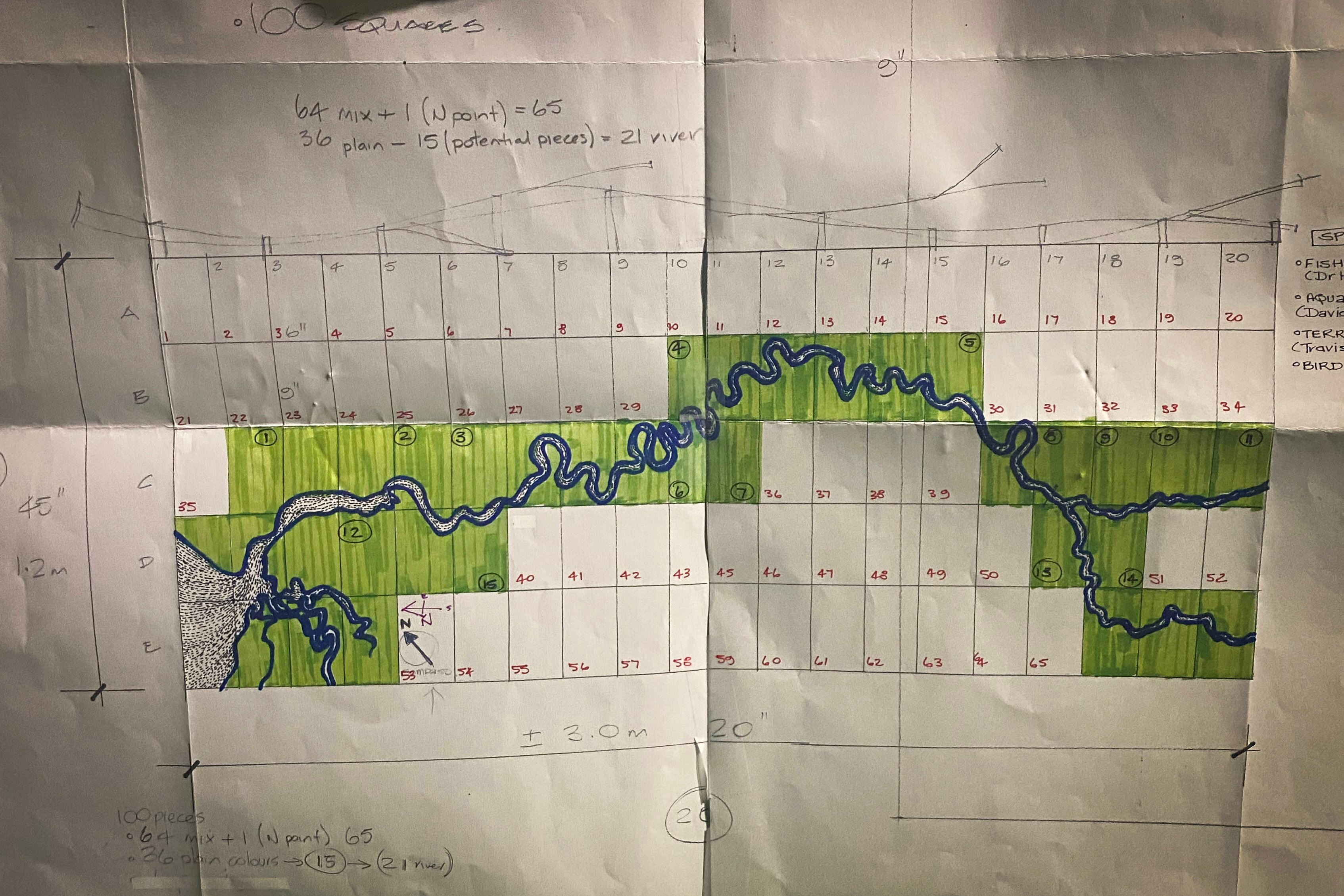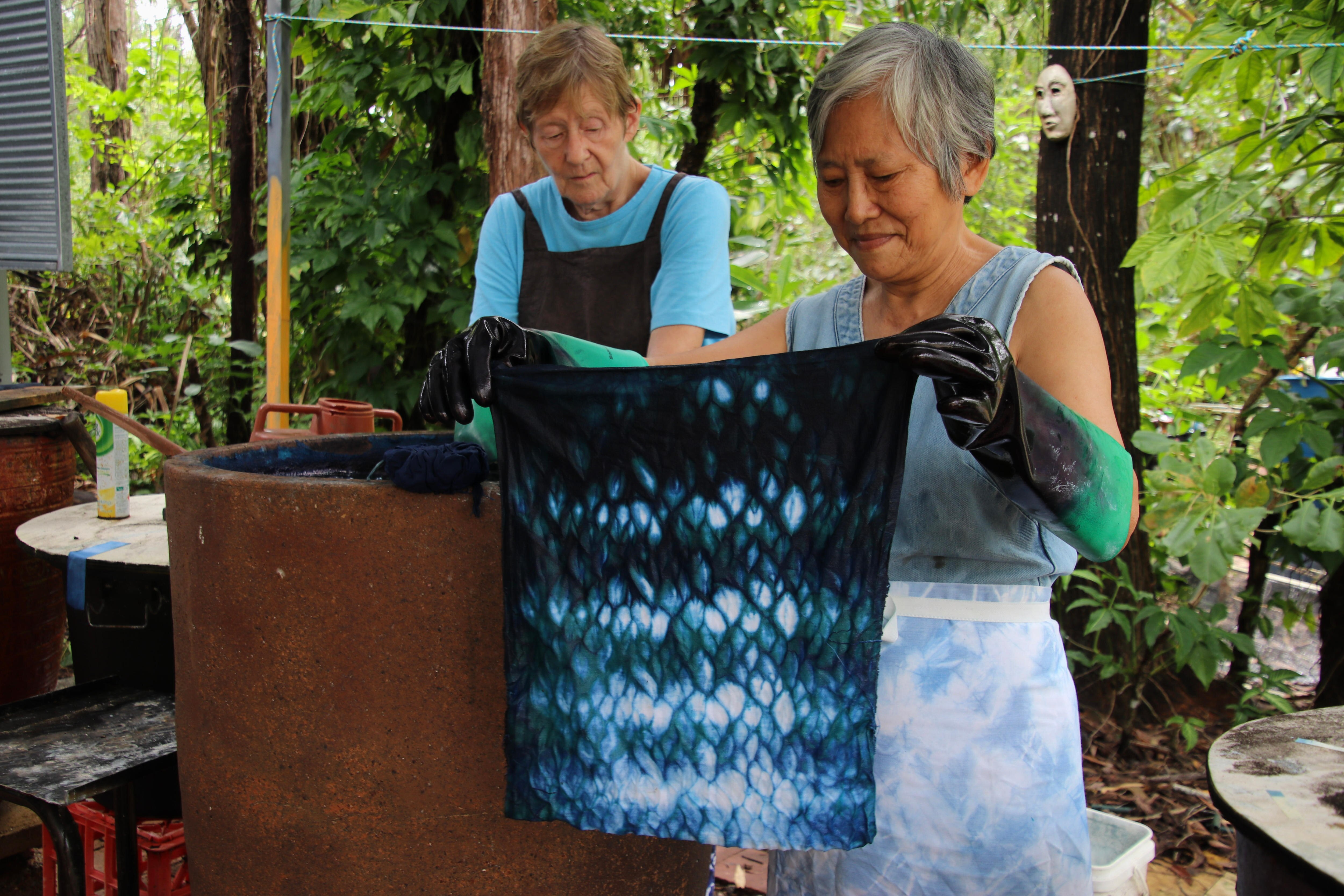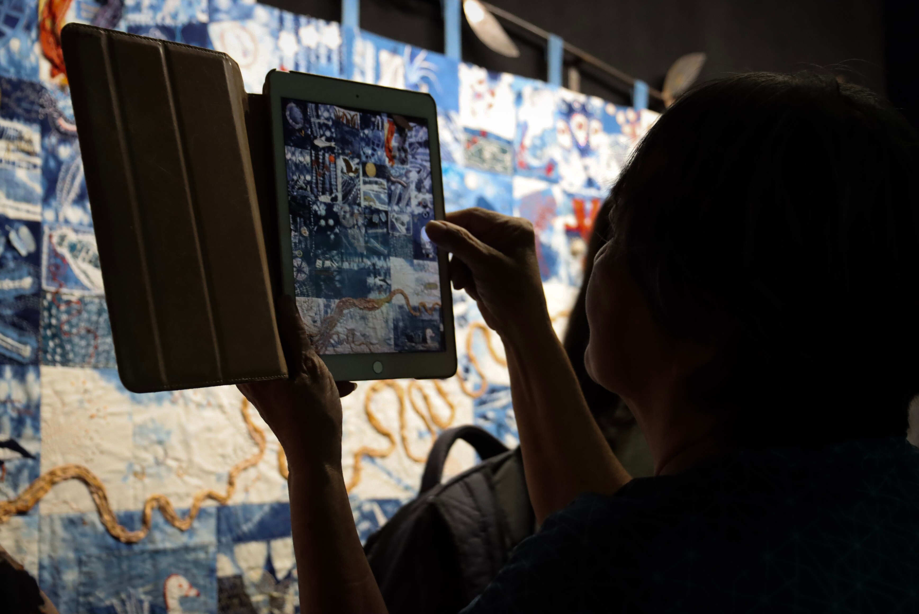 Before the stitching began, each participant was given a list of plant, fish and animal species along with several pieces of recycled calico dyed with indigo to represent water.