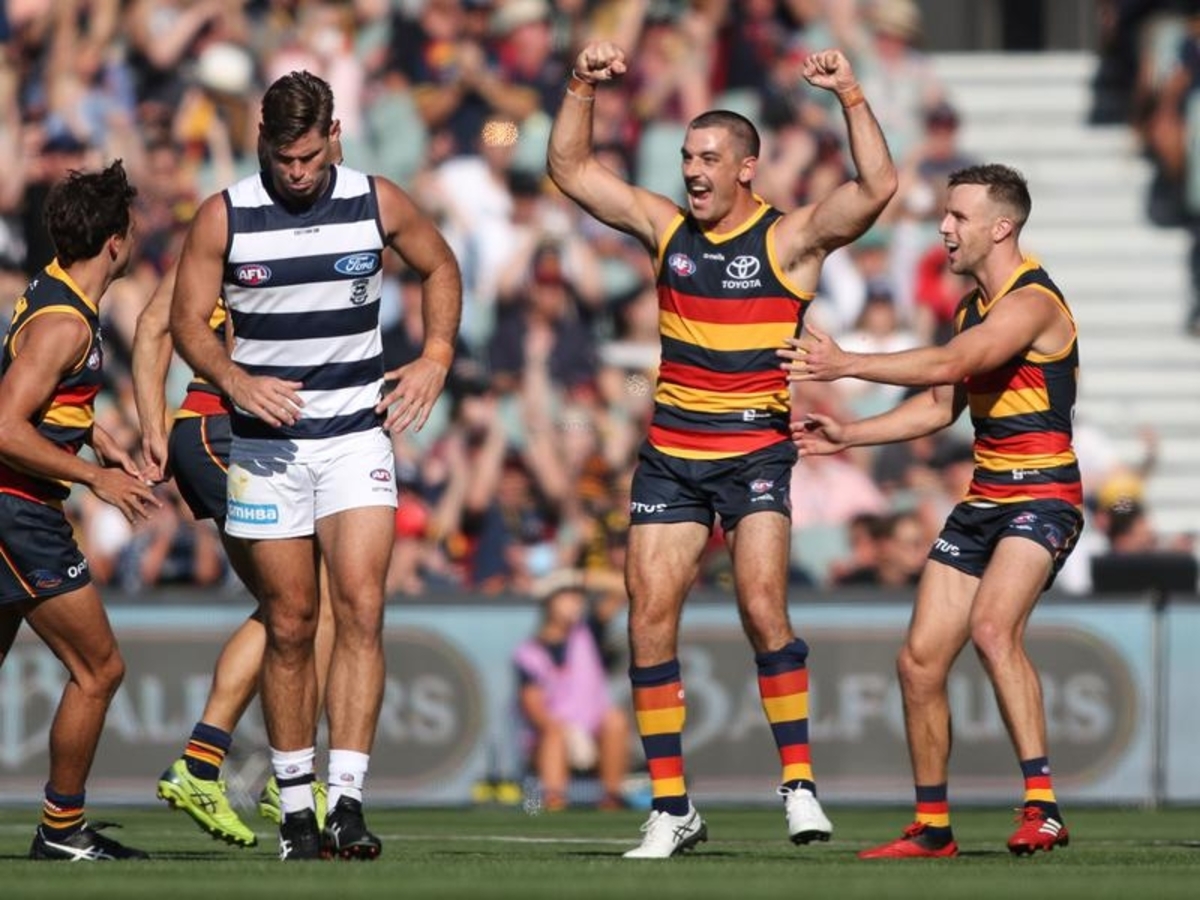 Spearhead Taylor Walker has kicked five goals to inspire unfancied Adelaide to a 12-point win against Geelong in the first major boilover of the AFL season.