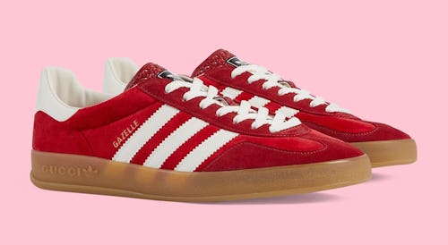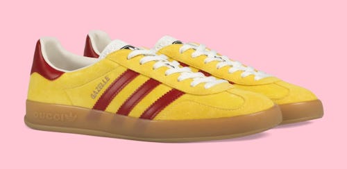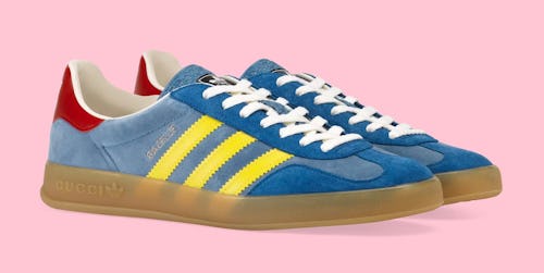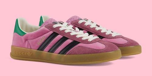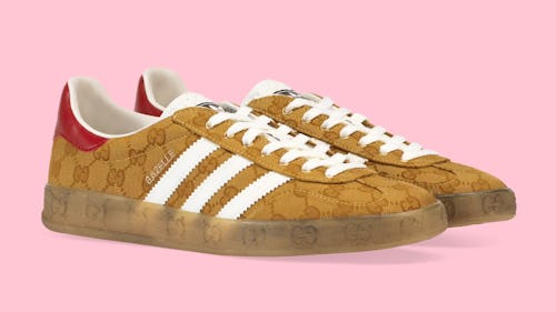 Still, Adidas is known best for its sneakers, making its co-branded Gazelle the most coveted piece of the collaboration. Multiple iterations of the kicks are available, with some sporting green suede, blue and yellow hits, translucent soles, and pink and green color blocking. The highlight of them all is hard to miss: Decked out entirely in Gucci’s signature monogram, one Gazelle sneaker features red leather heel tabs (also flaunting Gucci branding), translucent soles (also flaunting Gucci branding), and a debossed tongue (yes, also flaunting Gucci branding). Only Adidas’s white Three Stripes, gold Gazelle branding, and Trefoil logo appear on the footwear.