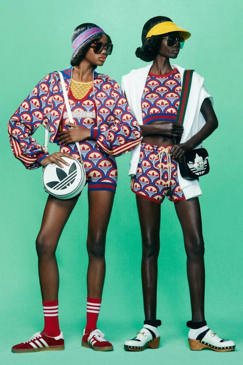 Although this release is only the first from Adidas and Gucci, with more expected later this year, there’s already an extensive selection to choose from. Ready-to-wear apparel including shirts, joggers, jumpsuits, and skirts all bear colorful prints — with many blending Adidas’s Three Stripes with Gucci’s Web print. Tracksuits, a heavy theme throughout the collection, come in multiple styles including shorts and flared pants variations. Each piece is meant to blend seamlessly between tennis courts and luxury events, the latter of where they’ll undoubtedly make the most appearances.