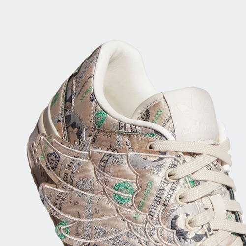 Detachable Wings sit by the lace unit, also bearing a cash print. Their design has changed slightly from the first Wings models — angled downwards rather than pushed back towards the heel — although much of the shoe remains untouched to pay tribute to Scott’s first venture with Adidas.