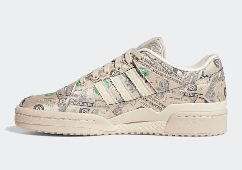The entirety of the Forum’s upper is covered in money graphics, save for its cream laces, Adidas Trefoil tongue tag, and Three Stripes. Unlike its high-top counterpart, the low-top sneaker doesn’t feature dark green accents, making the design slightly more wearable. Scott’s signature remains etched onto the medial midsole for good measure.