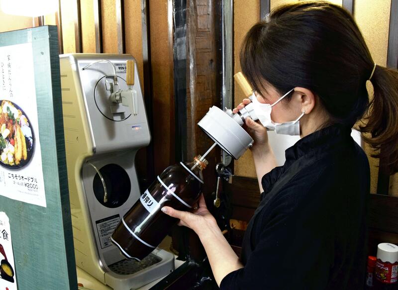 At Shokuji-dokoro Aoi Honten, a restaurant in Toyota, Aichi Prefecture, Mie Ninomiya, an employee, was easily able to replace a plastic bottle of draft beer. She was refilling "Tappy," which is a draft beer tap developed by Kirin Brewery and has been used in such regions as Chubu and Kyushu since November.
