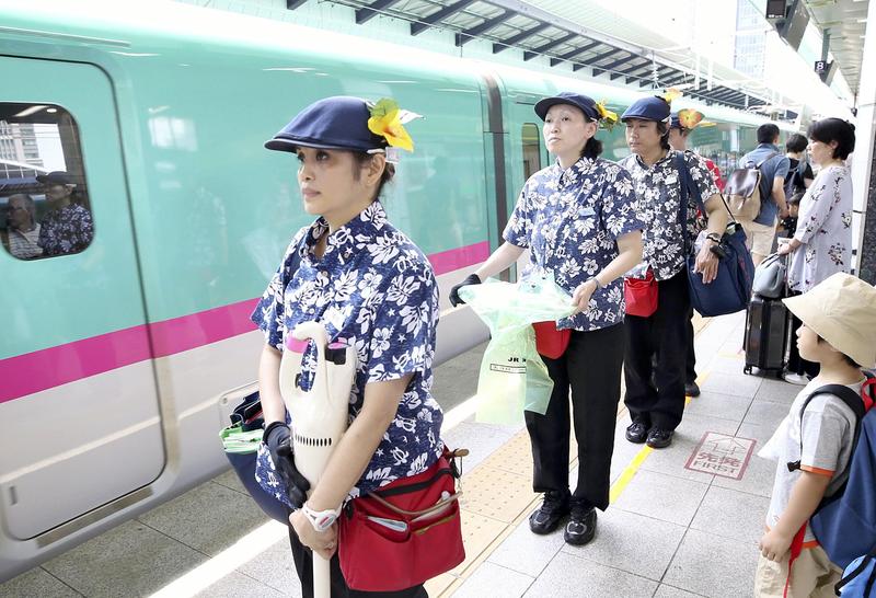 Cleaning crews of Shinkansen bullet trains operated by East Japan Railway Co. began wearing Hawaiian shirts on Saturday. Crews in Hawaiian shirts will clean the trains of the Tohoku, Joetsu and Hokuriku Shinkansen lines until around the end of August.