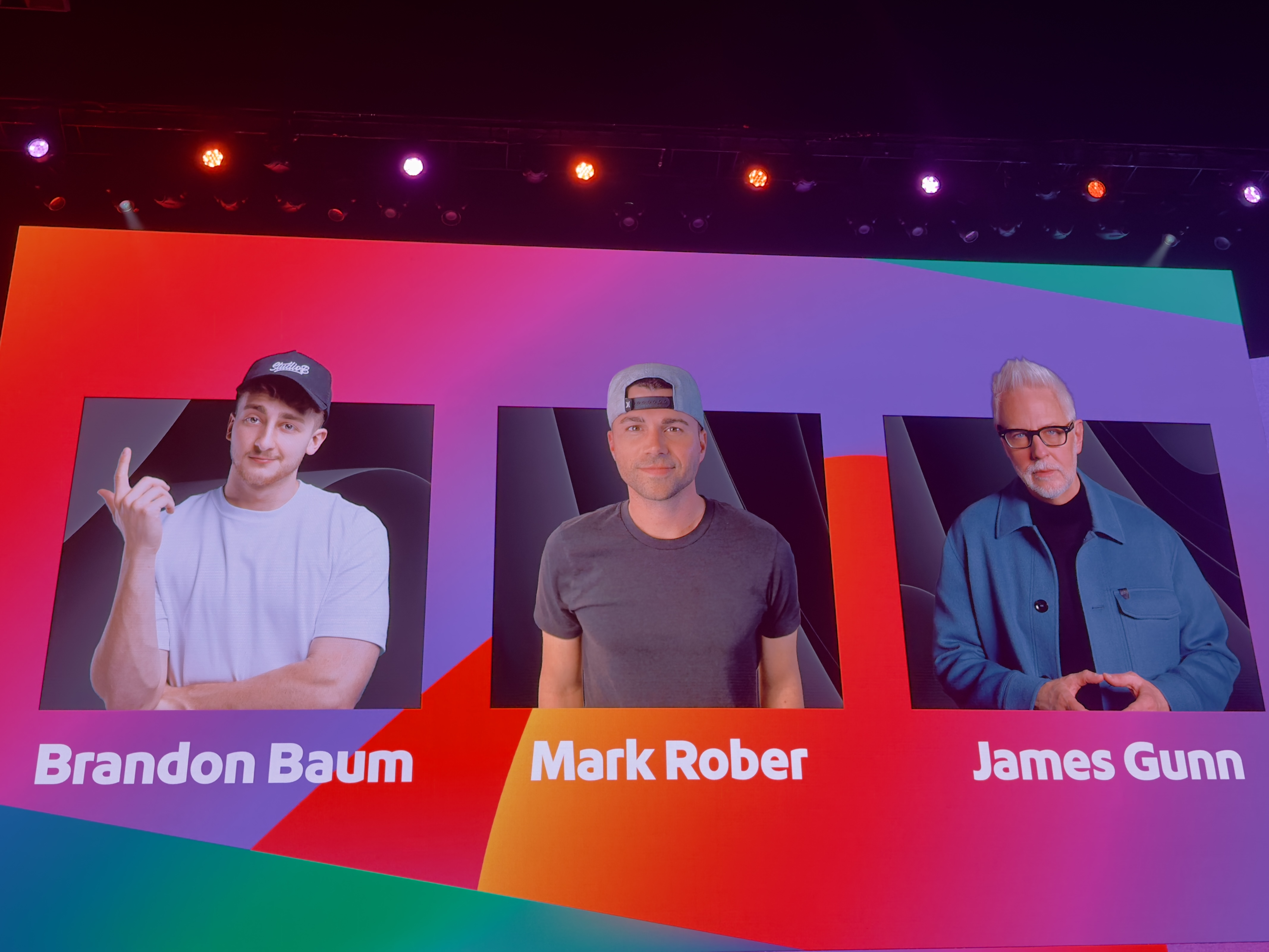 We're promised a live creative production from Brandon Baum on stage this morning, showcasing his work with an Adobe Express demo. Mark Rober and James Gunn are also speaking.