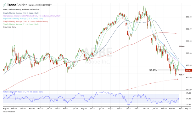 Let’s look at the chart to see if there’s any reason to build a case around buying Adobe down here.