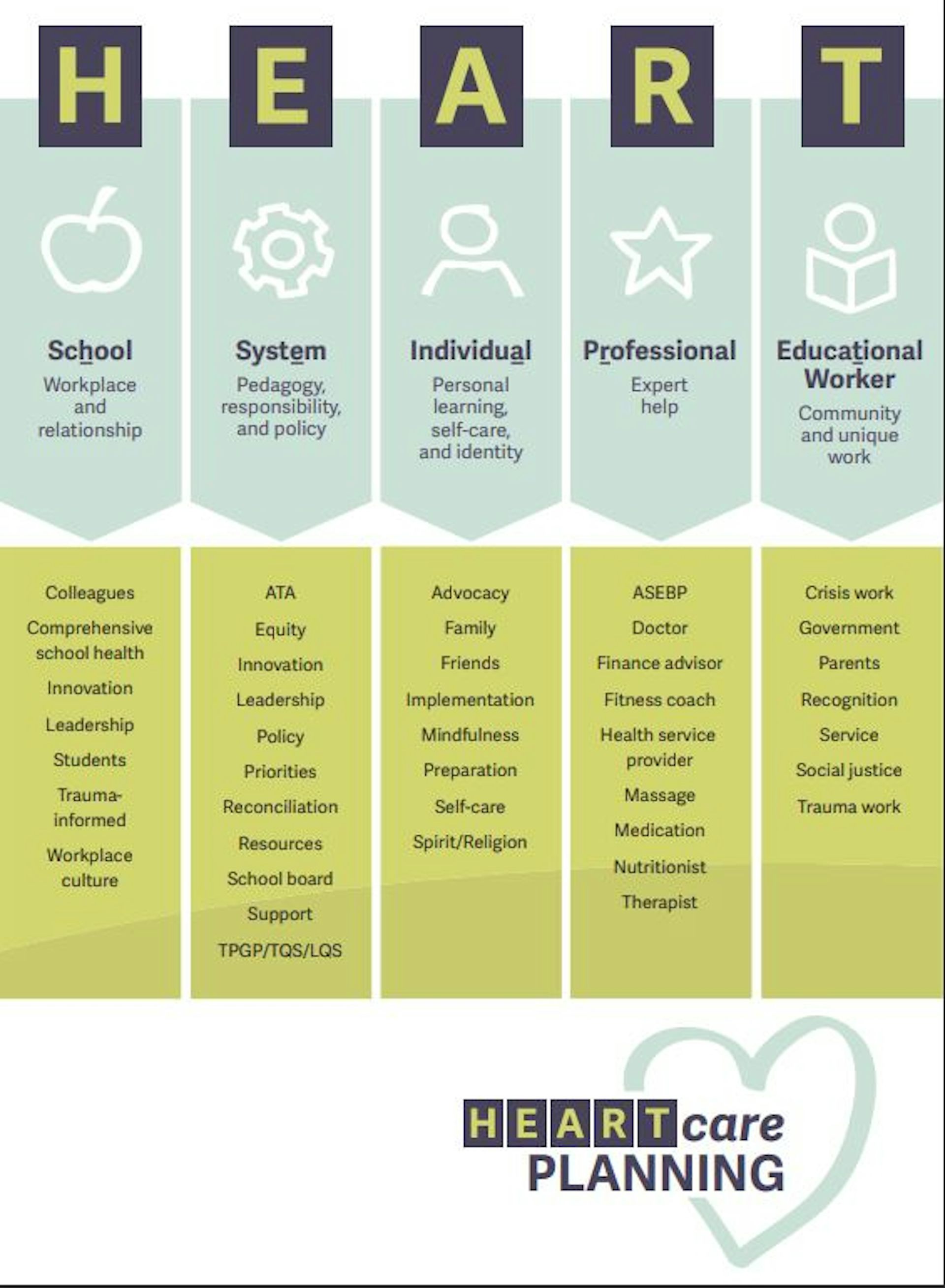 HEARTcare planning suggests that workplace wellness is the collective responsibility of all levels of the educational system including school-based staff, school district leaders and personnel, elected and appointed government officials, teacher associations, educational support organizations and support staff unions.
