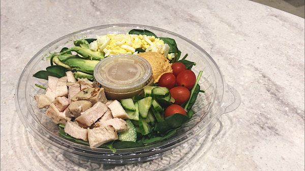 Welstead chose the Powerhouse salad at Potbelly's, made with grilled chicken breast, avocado, hummus, hard-boiled egg, cucumber and grape tomatoes on a bed of spinach. She ordered the Potbelly's vinaigrette on the side.
