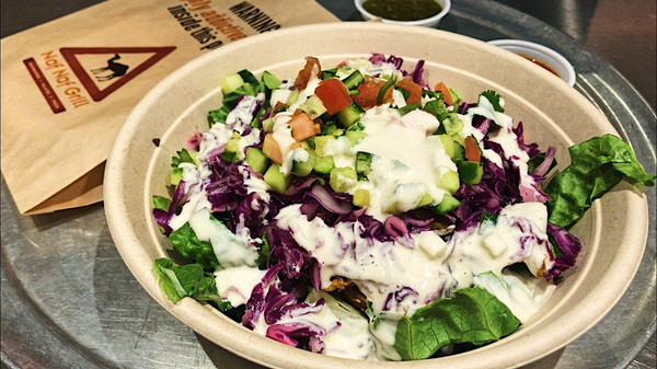 Order: Salad bowl with chicken, tahini and cucumber salad, with hot sauces on the side.
