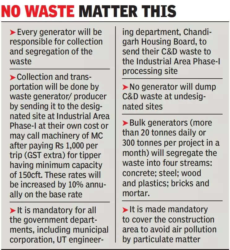 The draft policy—recently submitted by the municipal corporation to the UT administration—says penalty should be increased by 10% annually every April 1. It reads, “The authority to issue challan will rest with the sub-divisional engineer or junior engineer of the road wing or enforcement inspectors of the MC…The generator/ producer who are going to re-construct their houses should be levied the C&D waste processing costs at Rs 170 per square metre per storey and Rs 20 per square metre for new constructions at the time of approval of the building plan from the UT estate office or municipal corporation building branch. The rates shall be increased by 10% annually on base rate from April 1 every year.”