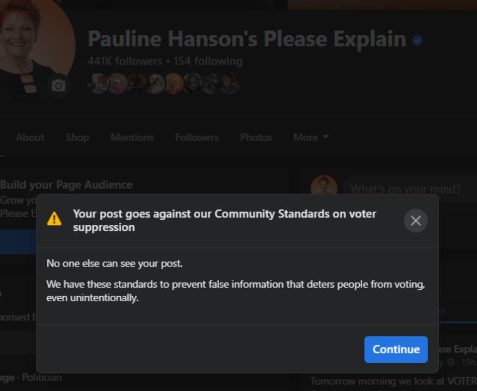 Earlier this month, the AEC and Facebook warned of "dangerous" voter fraud narratives spreading across Facebook, which were seeded by candidates from minor parties, including One Nation and the United Australia Party.