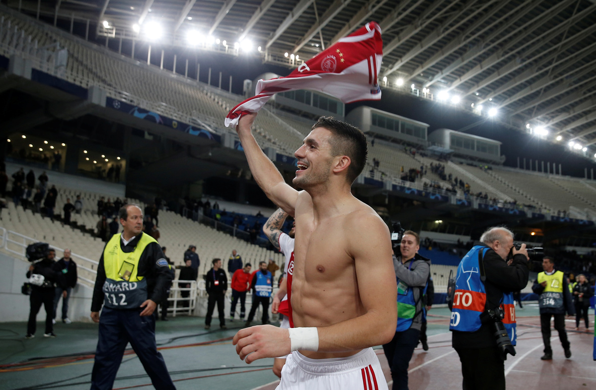 Soccer Football - Champions League - Group Stage - Group E - AEK Athens v Ajax Amsterdam - OAKA Spiros Louis, Athens, Greece - November 27, 2018 Ajax's Dusan Tadic celebrates after the match REUTERS/Costas Baltas