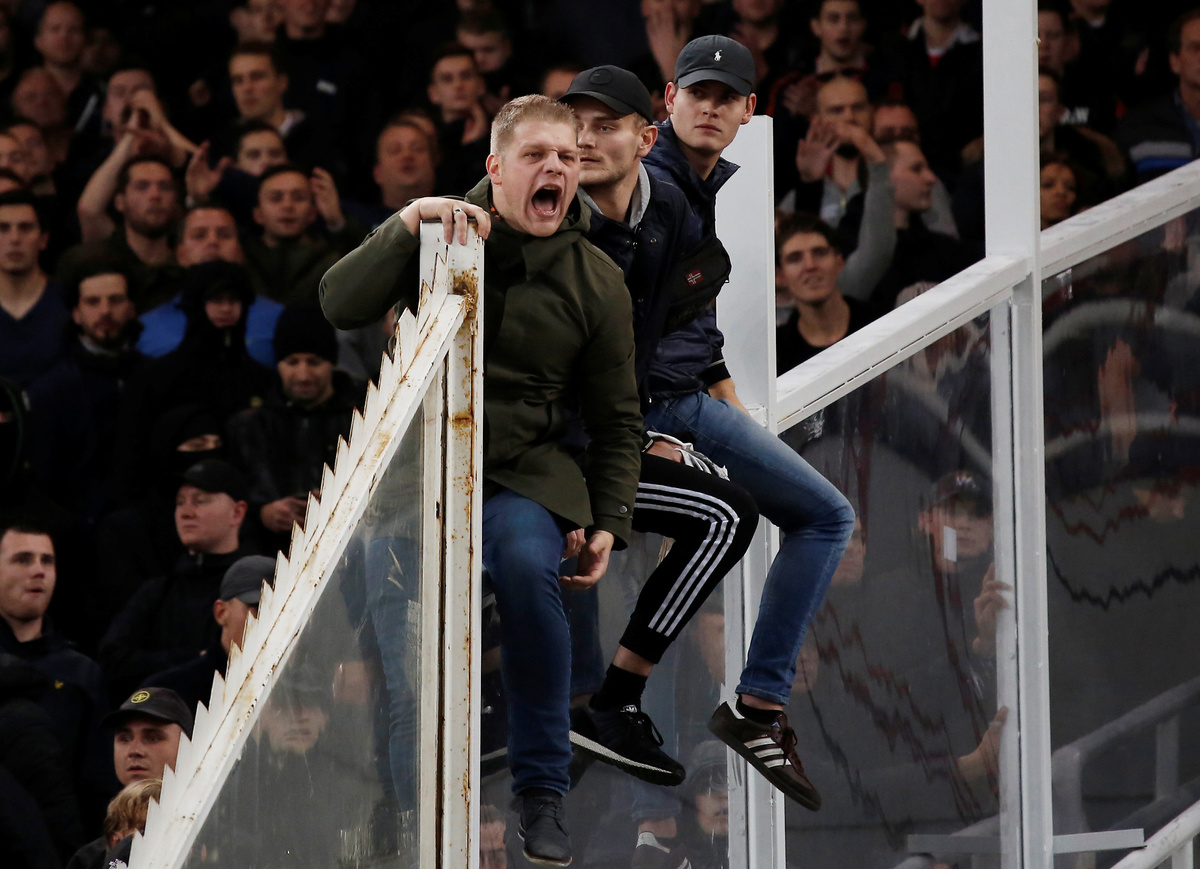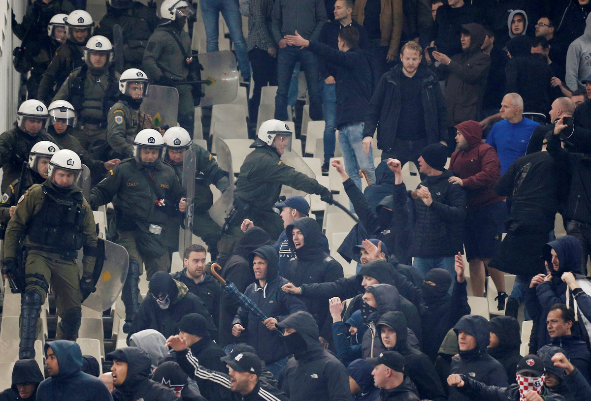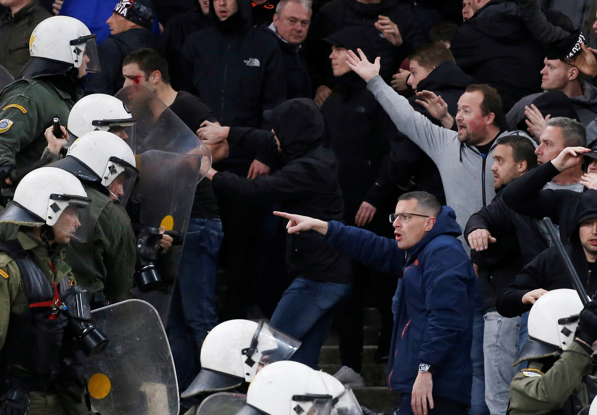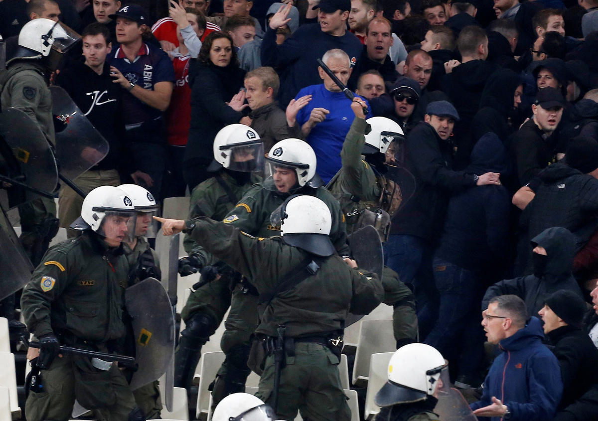 Soccer Football - Champions League - Group Stage - Group E - AEK Athens v Ajax Amsterdam - OAKA Spiros Louis, Athens, Greece - November 27, 2018 General view of an Ajax fan reacting after clashing with riot ploice in the stadium before the match REUTERS/Costas BaltasSoccer Football - Champions League - Group Stage - Group E - AEK Athens v Ajax Amsterdam - OAKA Spiros Louis, Athens, Greece - November 27, 2018 General view of riot police clashing with Ajax fans in the stadium before the match REUTERS/Costas BaltasSoccer Football - Champions League - Group Stage - Group E - AEK Athens v Ajax Amsterdam - OAKA Spiros Louis, Athens, Greece - November 27, 2018 General view of riot police clashing with Ajax fans in the stadium before the match REUTERS/Costas BaltasSoccer Football - Champions League - Group Stage - Group E - AEK Athens v Ajax Amsterdam - OAKA Spiros Louis, Athens, Greece - November 27, 2018 General view of riot police clashing with Ajax fans in the stadium before the match REUTERS/Costas BaltasSoccer Football - Champions League - Group Stage - Group E - AEK Athens v Ajax Amsterdam - OAKA Spiros Louis, Athens, Greece - November 27, 2018 General view of riot police clashing with Ajax fans in the stadium before the match REUTERS/Costas BaltasSoccer Football - Champions League - Group Stage - Group E - AEK Athens v Ajax Amsterdam - OAKA Spiros Louis, Athens, Greece - November 27, 2018 Ajax's Maximilian Wober, Frenkie de Jong and team mates celebrate at the end of the match as AEK Athens' Marios Oikonomou looks dejected REUTERS/Costas Baltas
