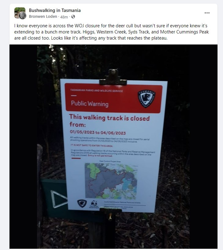 The cull runs from May 1 to June 4 and includes the national park, the adjoining western section of the Central Plateau Conservation Area and some parts of the Meander and Great Western Tiers Conservations areas.
