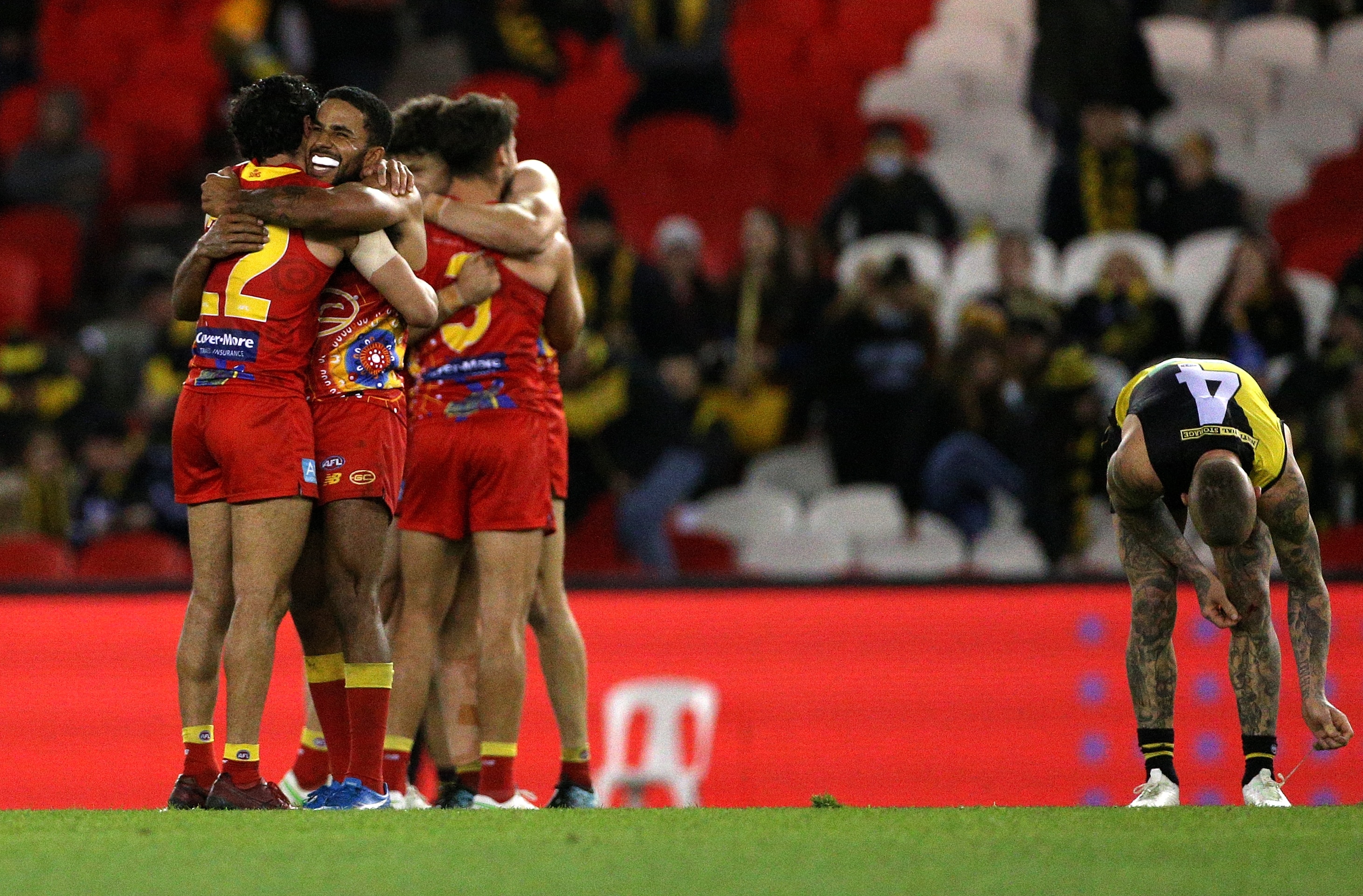 Richmond's shaky premiership defence has taken another hit after the Gold Coast Suns caused a major boilover with an extraordinary 10-point victory at Docklands.