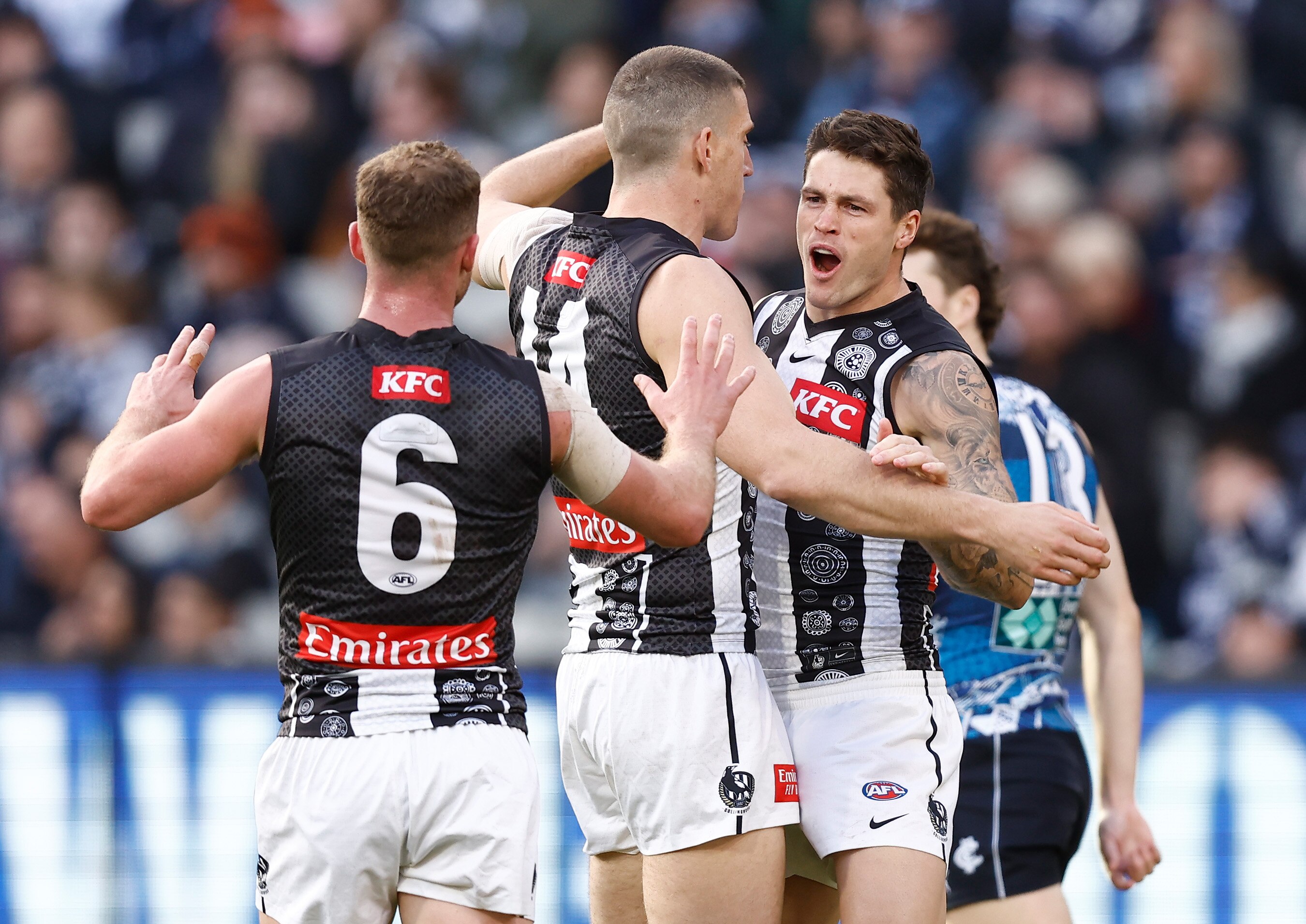 Jordan De Goey (27 disposals, 13 contested possessions, five clearances) and Scott Pendlebury (21 touches, eight tackles) were also important, while Brody Mihocek (four) was the game's leading goal-kicker.
