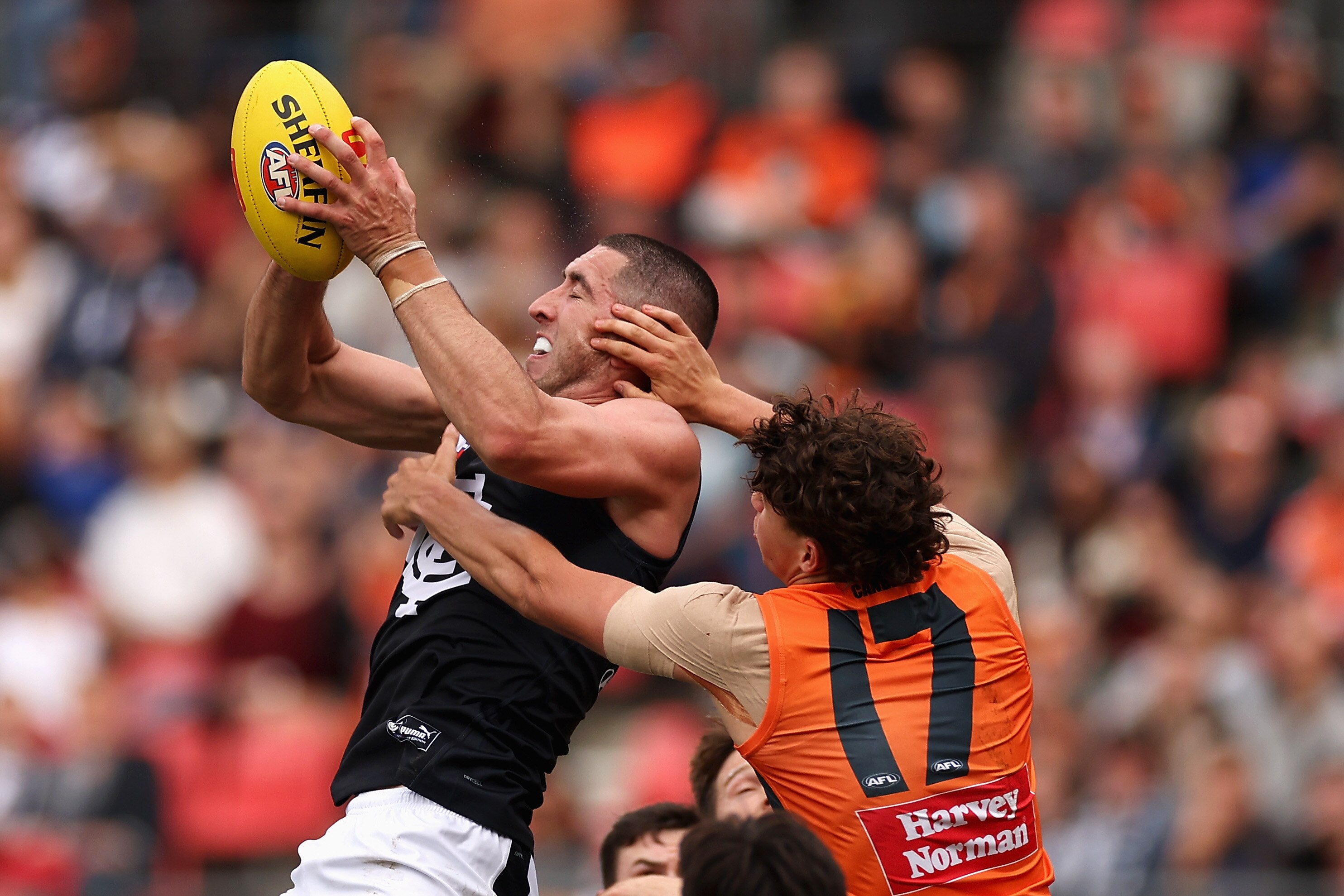 Carlton overcame a spirited GWS challenge with a controversial decision in its favour and a late goal to Charlie Curnow sealing their triumph at Giants Stadium.