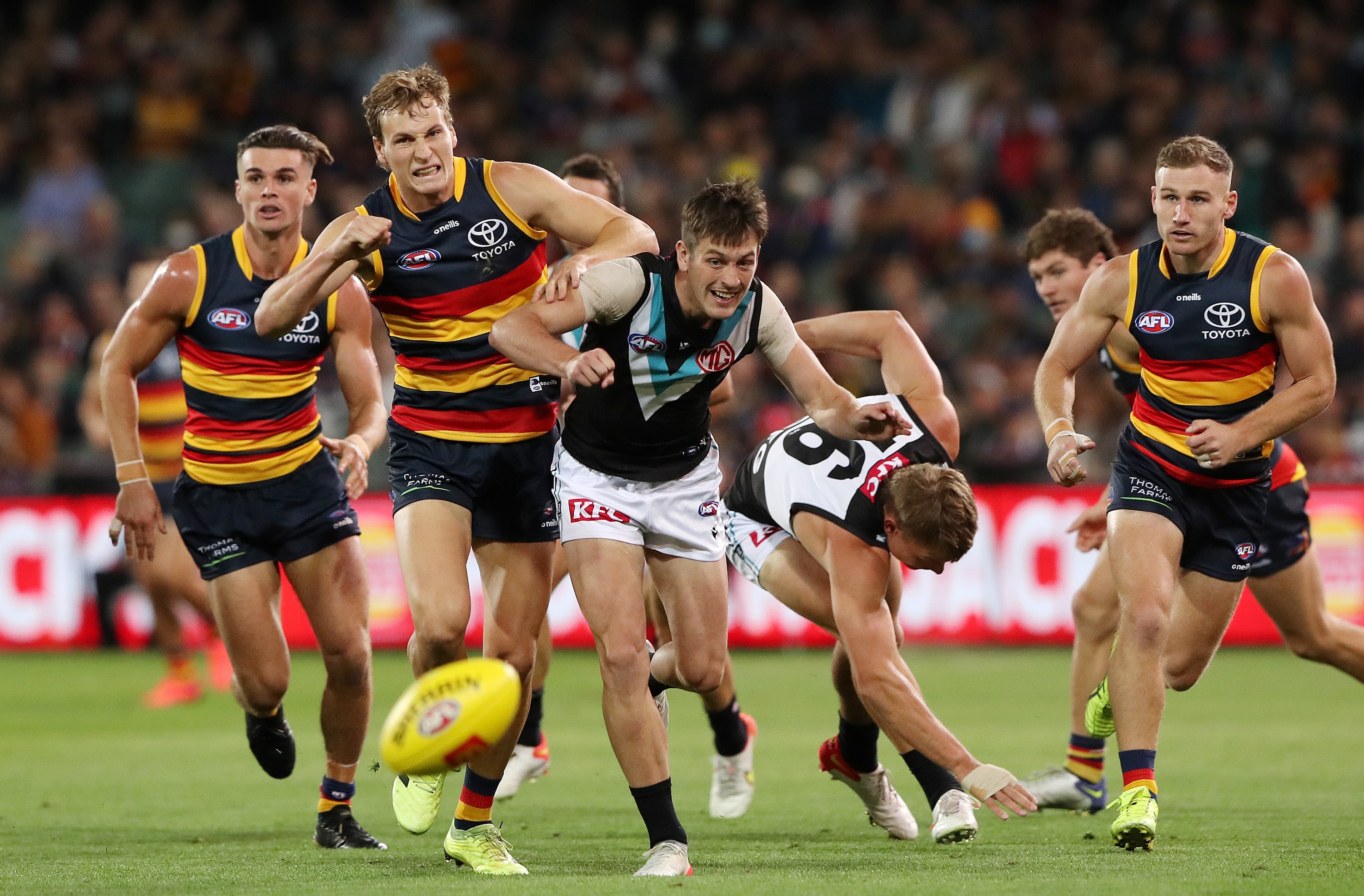Adelaide were two points down with just four seconds remaining when Lachlan Murphy grabbed a loose ball in the forward line and was crunched high by Port's Sam Mayes.
