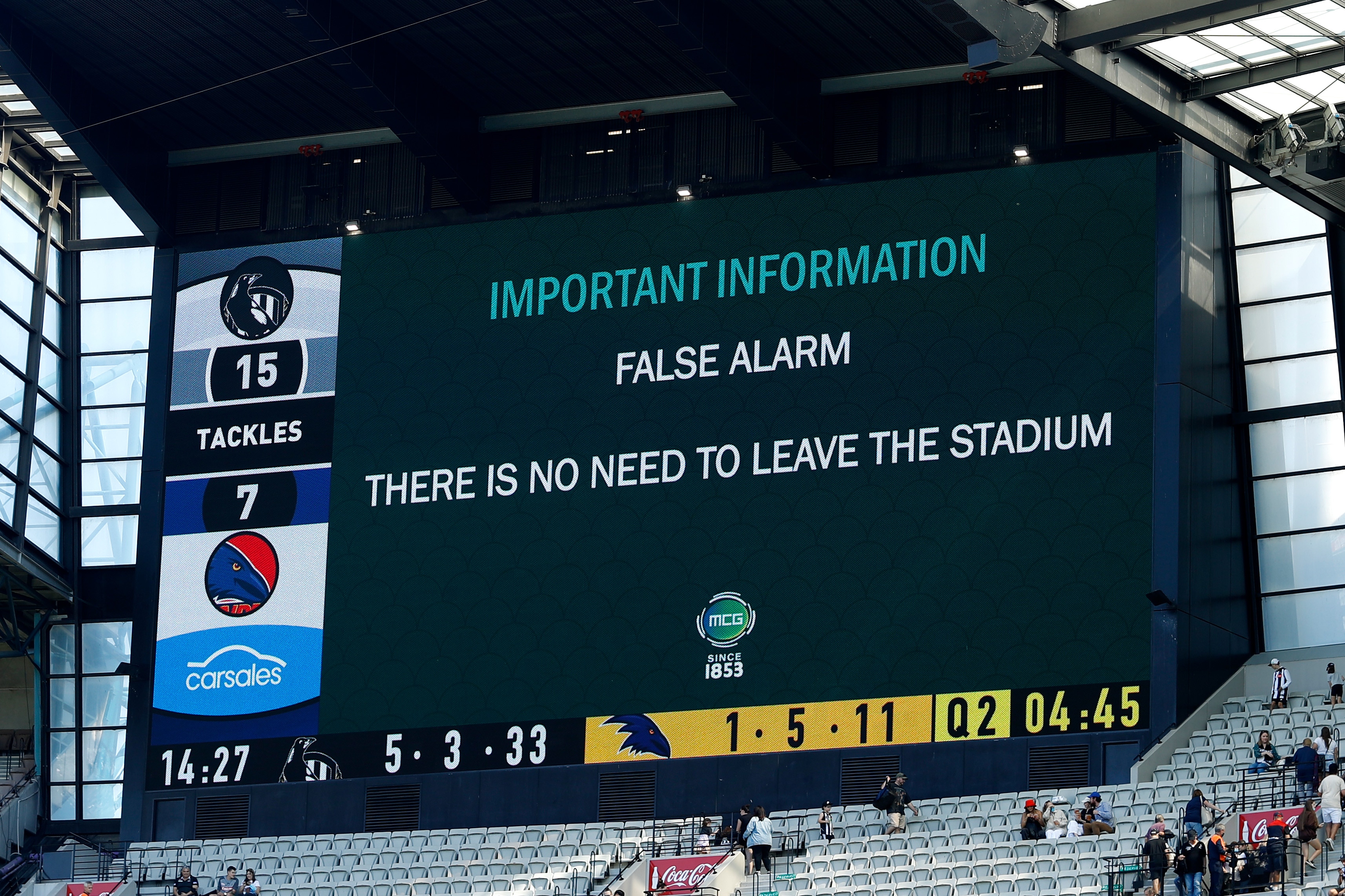 An evacuation alarm sounded early in the second quarter at the MCG on Saturday, leaving fans shocked and confused as they started heading for the exits.