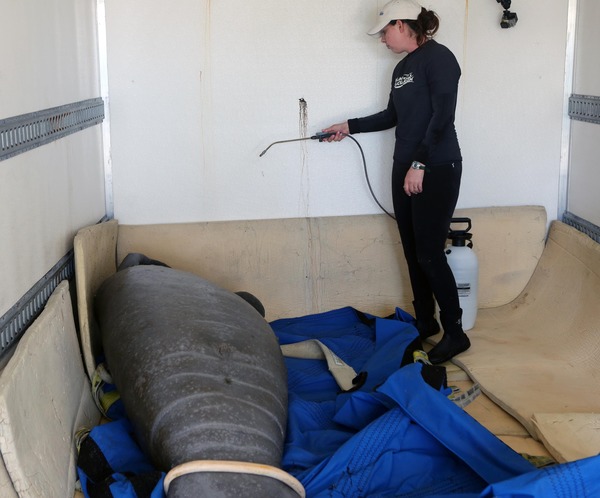 Inside a shallow enclosure, a team of employees helped wrap Junebug in a blue tarp and pushed her into a large crate. A crane operator then hoisted her a couple of dozen feet into the air and slowly lowered her into the rear of the six-wheeled vehicle.